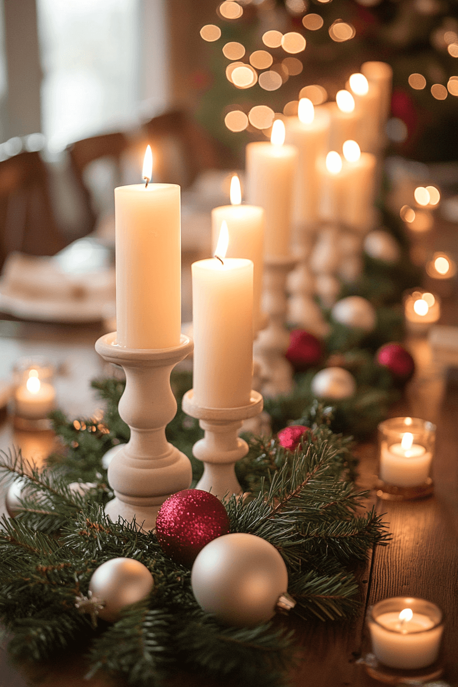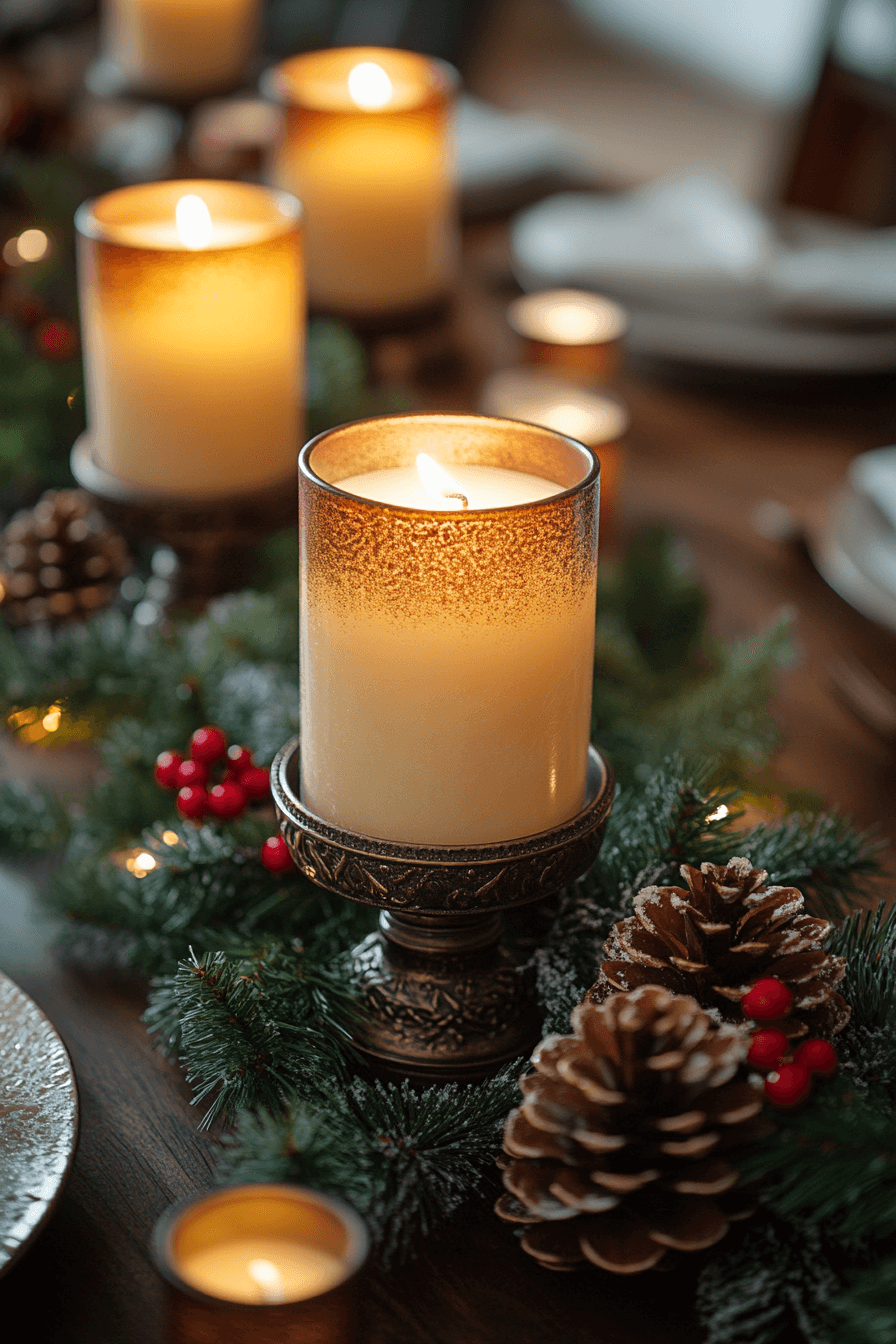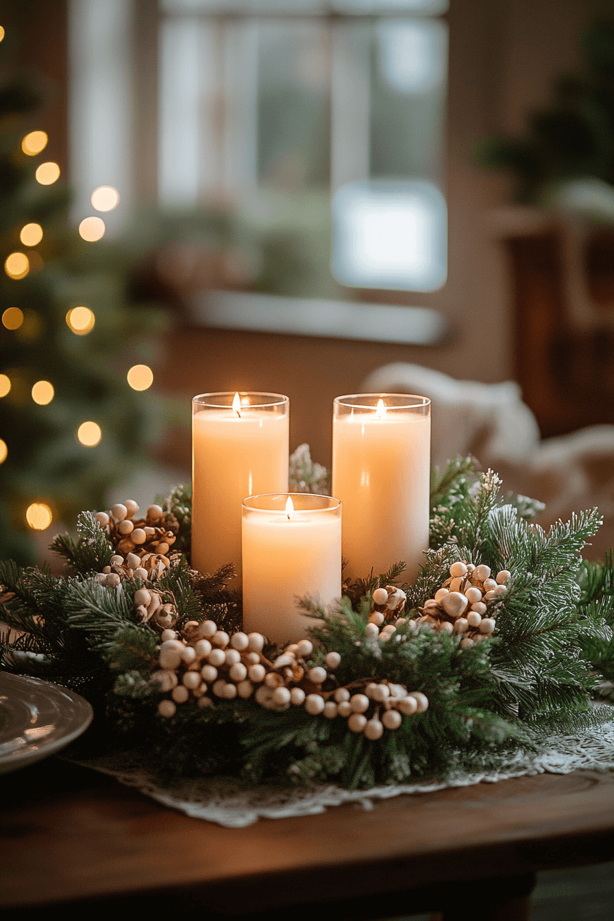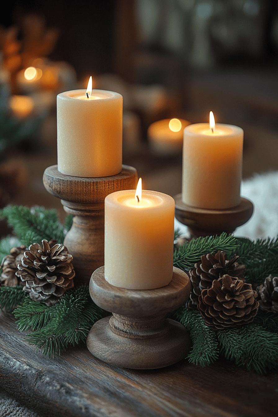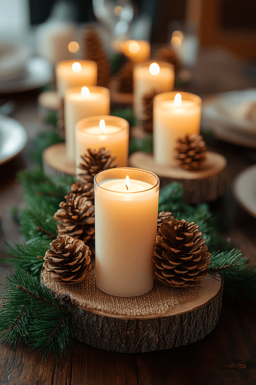 Rustic candles paired with wood slices and burlap create a warm, welcoming touch to any festive table. The natural textures instantly evoke comfort, blending perfectly with evergreen sprigs for added charm. These Christmas candle decor ideas infuse your space with countryside elegance and nostalgic flair. The soft glow invites heartfelt conversations and cozy memories.