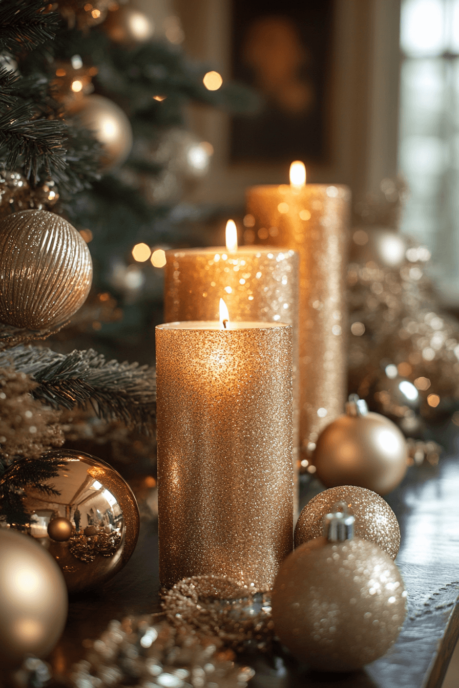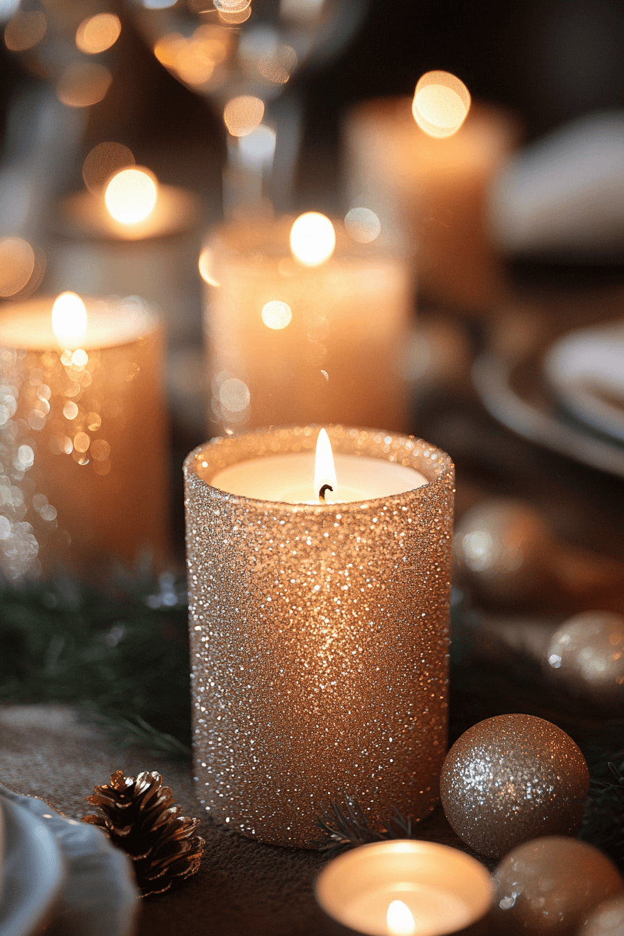 Add shimmer to your holiday display with sparkling candle jars dressed in glitter and sequins. These dazzling accents catch every flicker of light, bringing a bold and festive vibe to any room. Christmas candle decor ideas like this turn ordinary items into magical pieces in minutes. Pair with twinkle lights for a show-stopping effect.