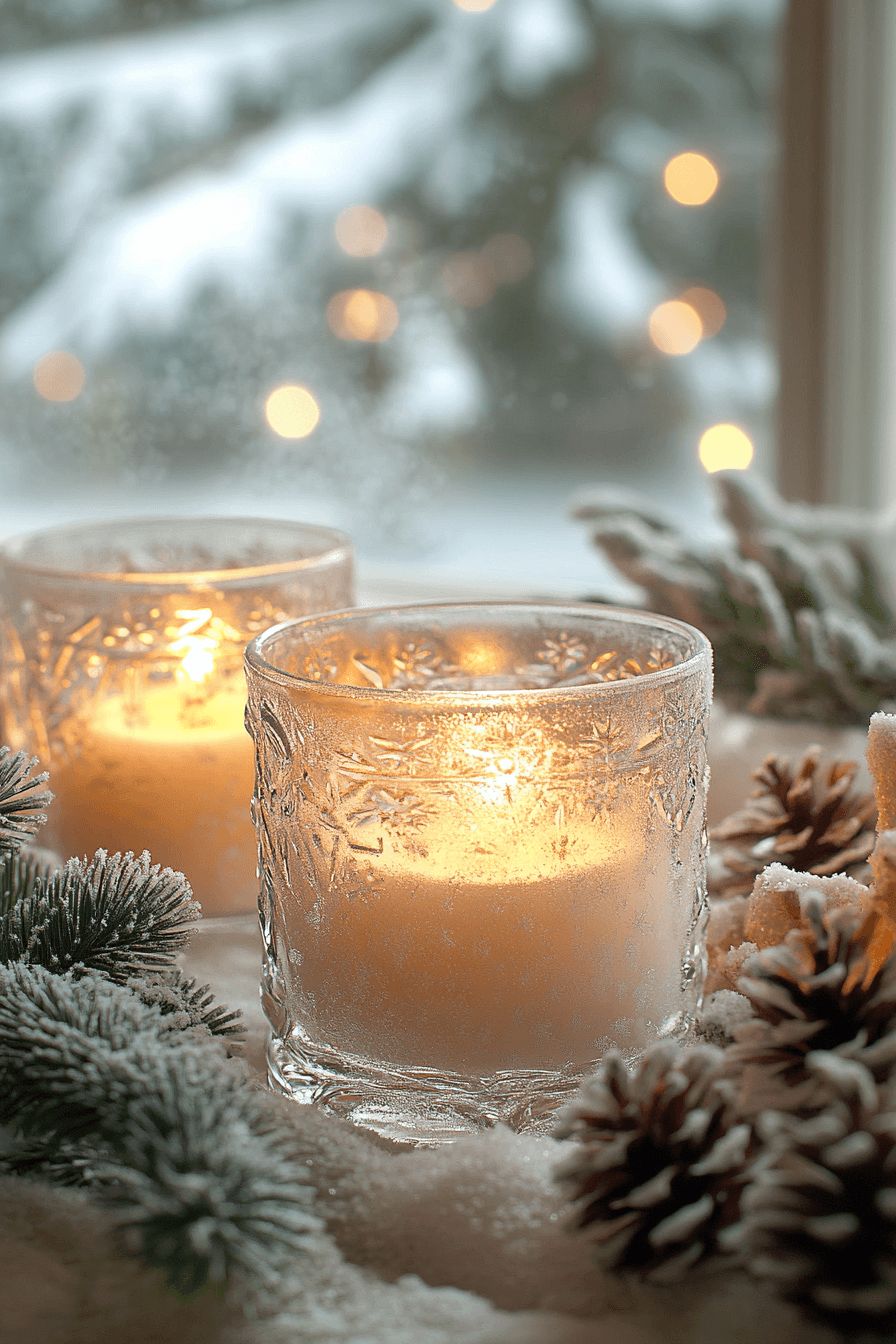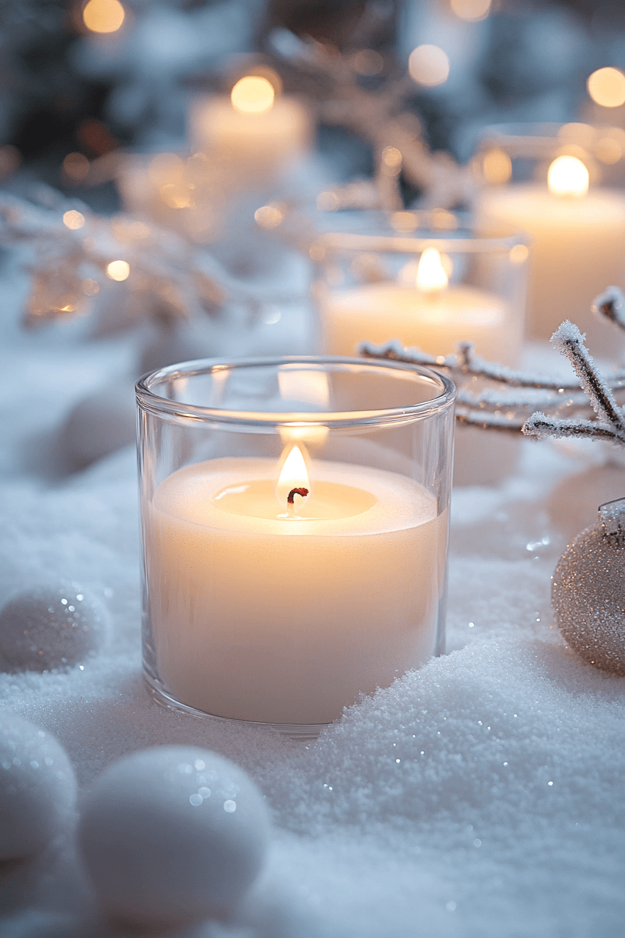 Frosted glass holders cast the dreamiest glow, like candlelight shining through icy windows. These Christmas candle decor ideas offer a serene, wintry vibe perfect for white Christmas styling. Set them along mantels, windowsills, or tables for a soft and snowy feel. They bring a peaceful charm to any room.