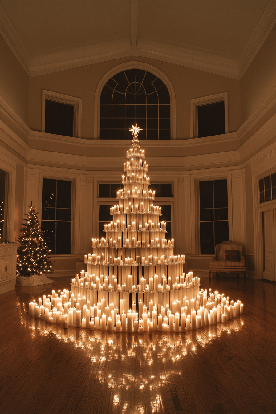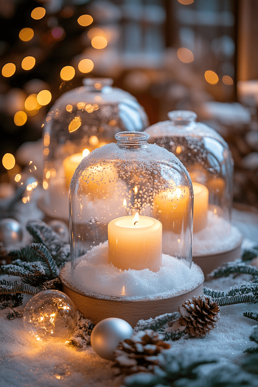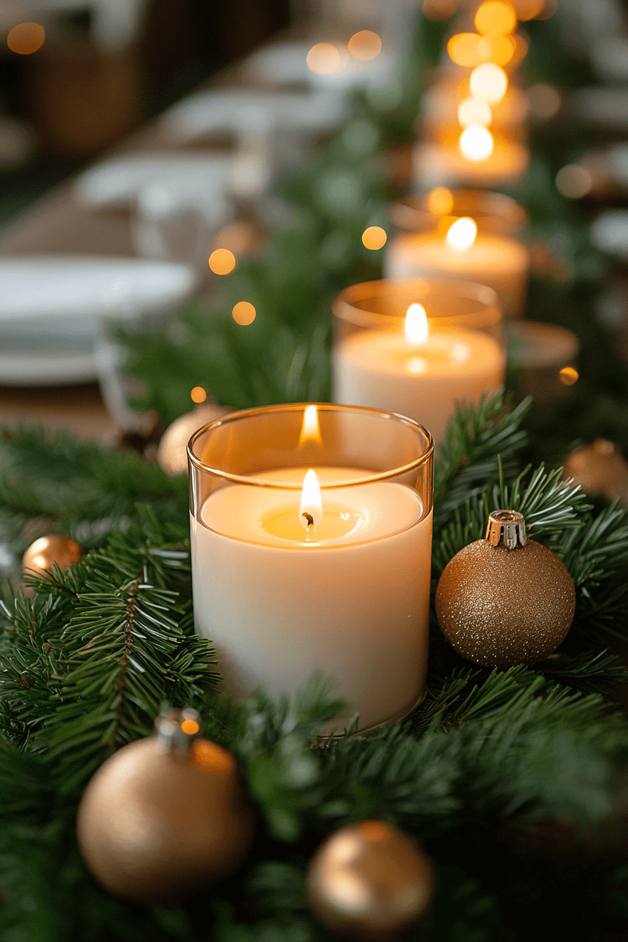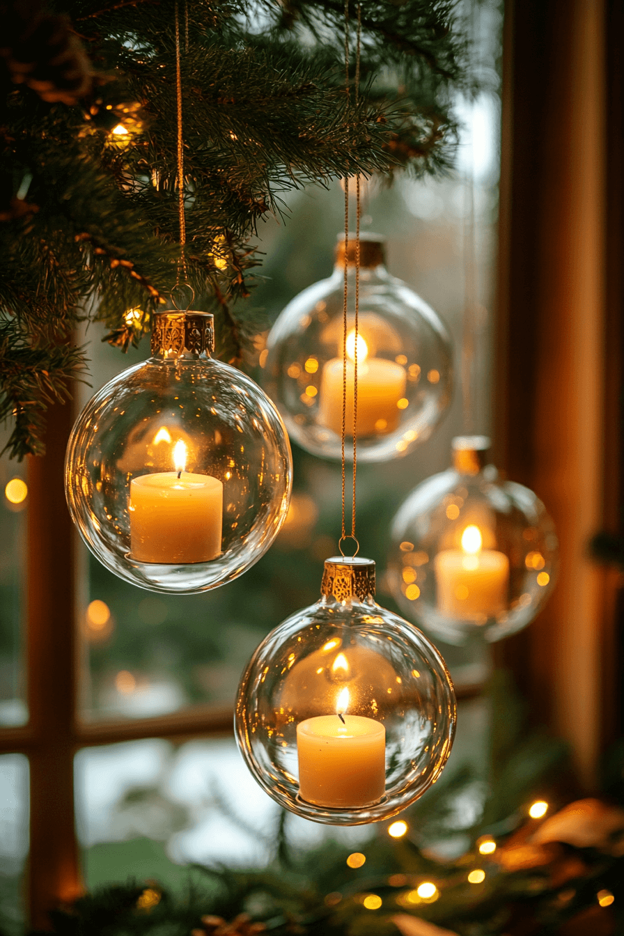Ornaments filled with tiny candles combine festive sparkle with cozy lighting in a playful way. These Christmas candle decor ideas are unexpected and delightful, ideal for tabletops or hanging arrangements. The gentle glow within the ornament adds just enough magic. They’re perfect for a cheerful and creative display.