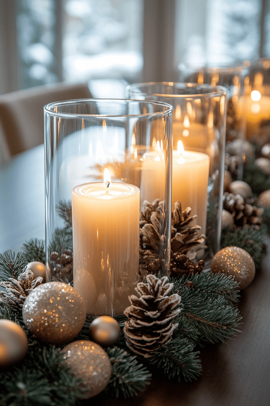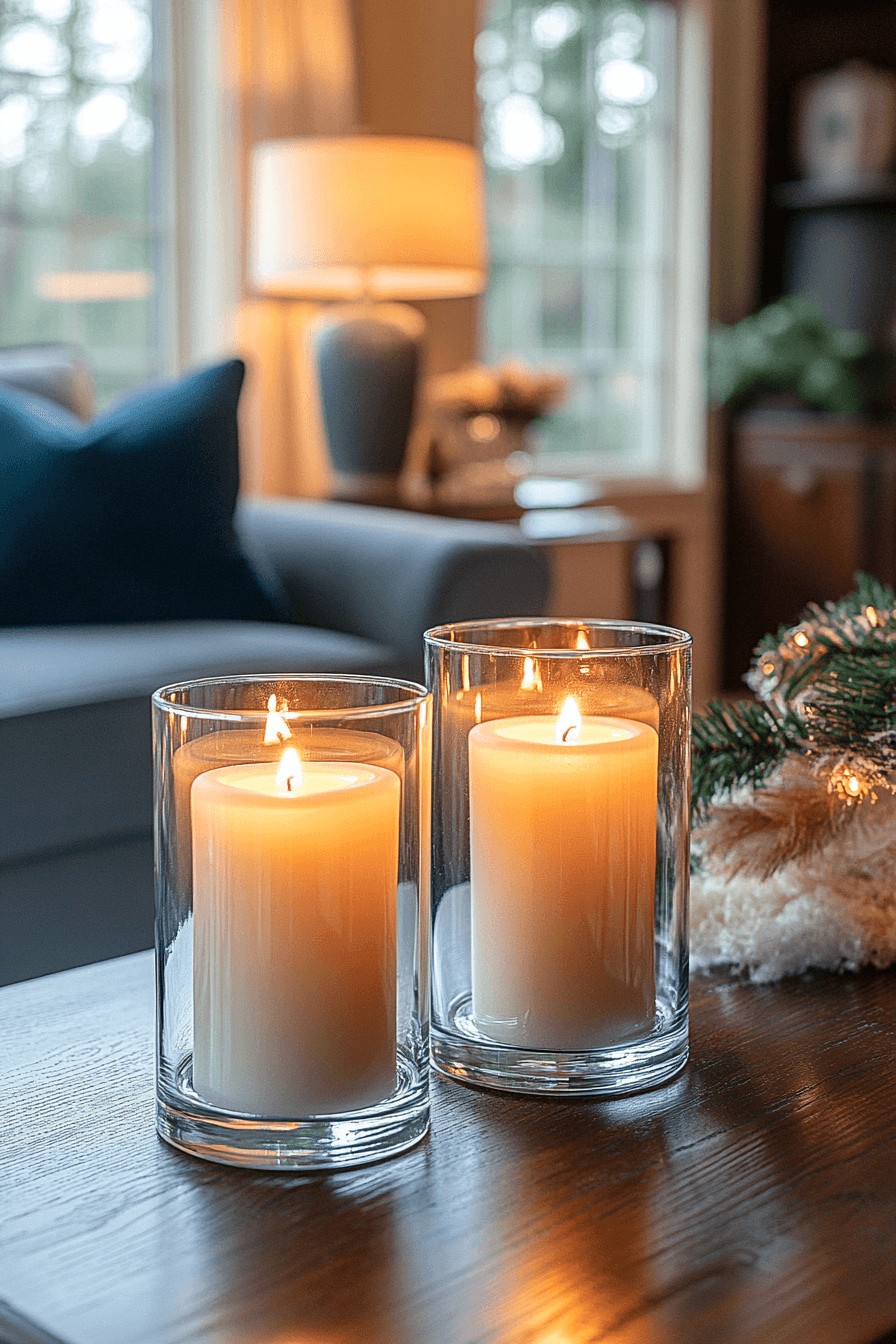 Pillar candles inside clear glass holders create a clean, minimal look while casting a gentle glow. These Christmas candle decor ideas work for both traditional and modern homes. Place them along bookshelves, mantels, or side tables for a refined touch. The effect is warm, serene, and timeless.