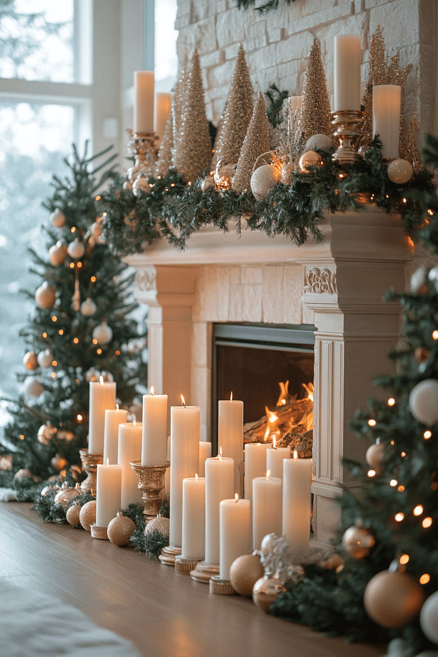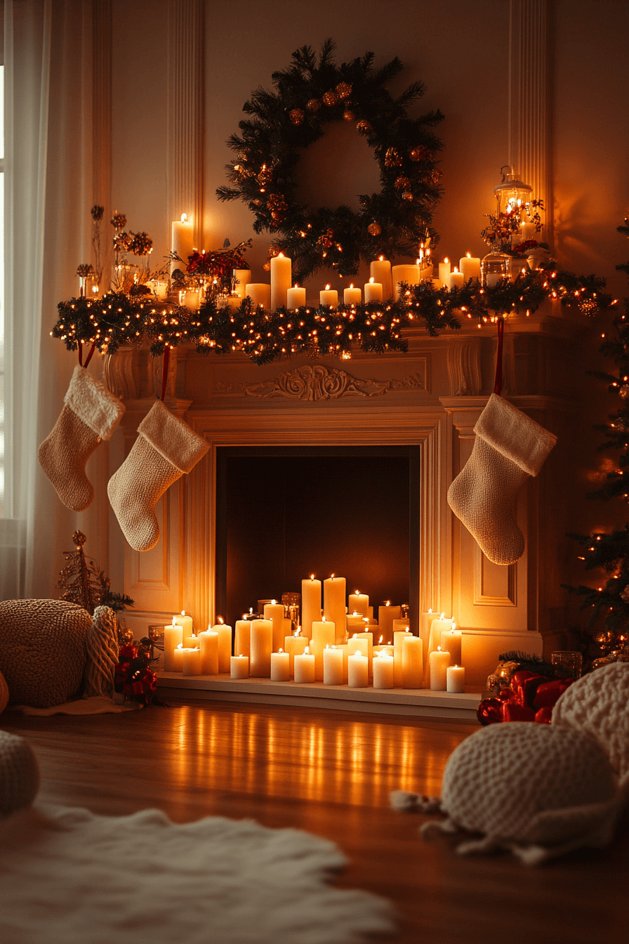Don’t have a working fireplace? Fill the hearth with candles of varying heights for a flickering focal point. These Christmas candle decor ideas bring the glow without the woodsmoke. It’s an elegant and cozy way to highlight your living space. The layered look adds instant warmth.
