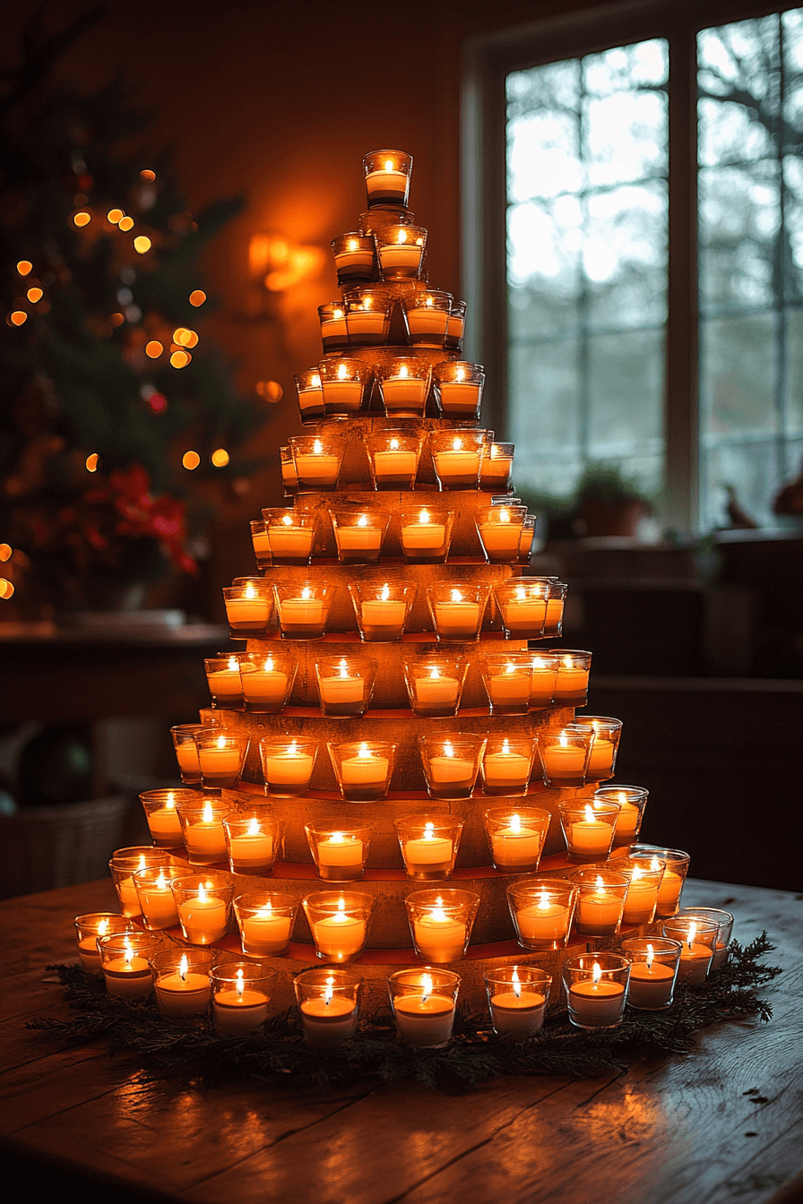 Tiny tea lights arranged like a tree or in festive shapes add a sweet glow to every corner. These Christmas candle decor ideas are perfect for cozy shelves, windows, or tiny spaces. The subtle twinkle brings magic without overpowering. It’s a budget-friendly way to spread seasonal joy.