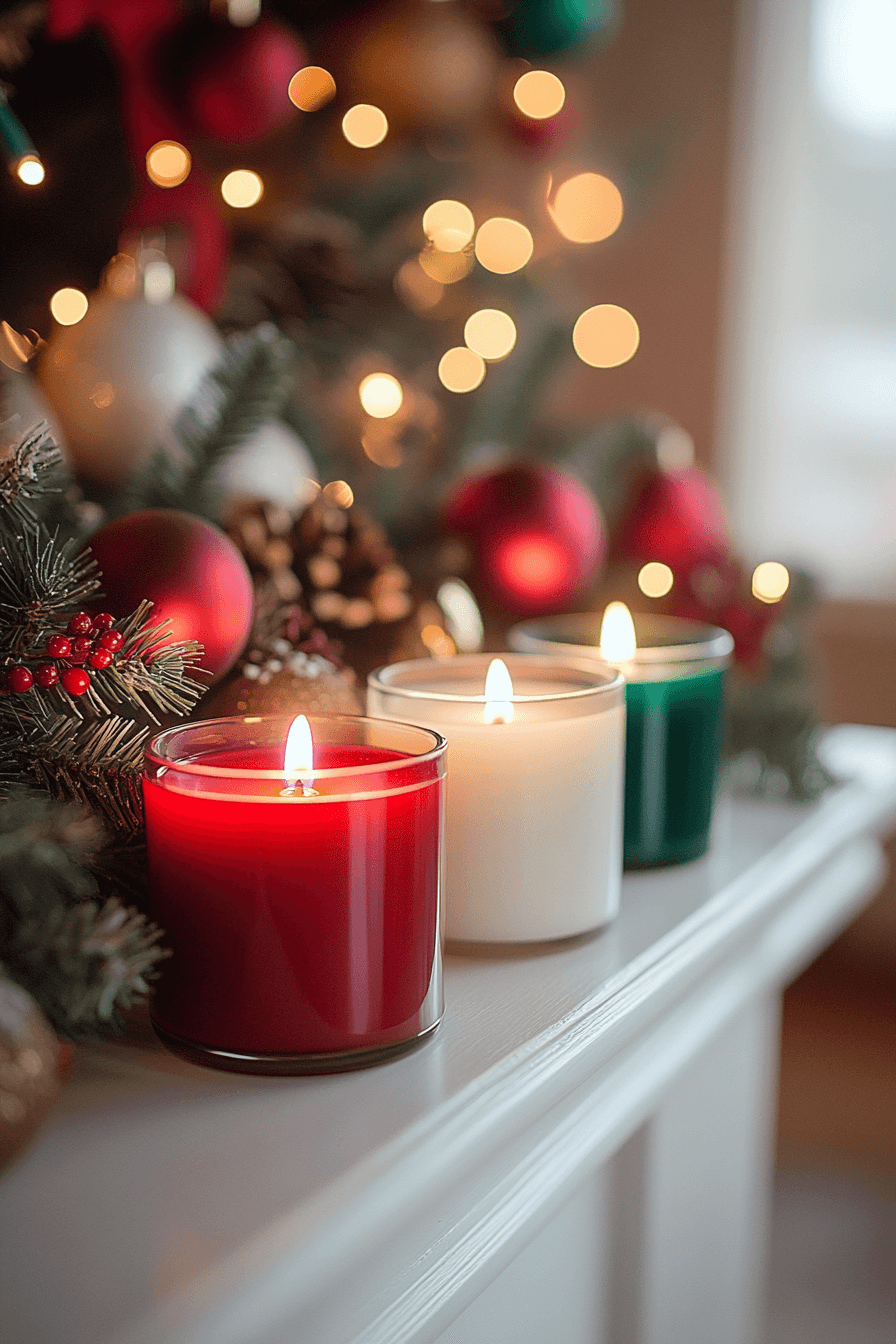 Classic red, green, and white candles bring bold pops of color that instantly scream Christmas cheer. These Christmas candle decor ideas energize your decor while keeping things festive and bright. Use them in centerpieces or accent clusters throughout the home. Pair with matching linens or ribbons for a coordinated effect.