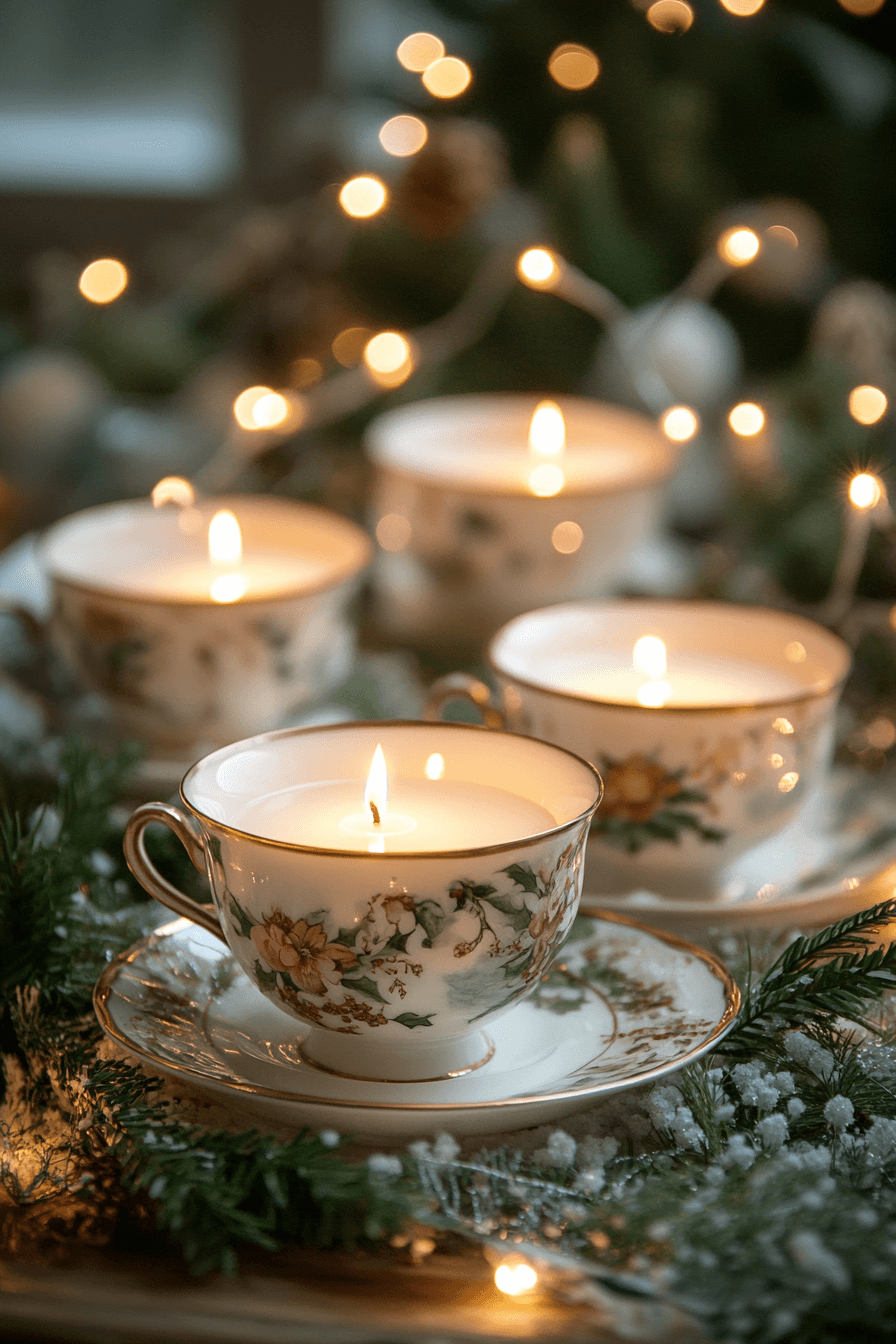 Repurpose antique teacups into unique candle holders filled with charm and personality. These Christmas candle decor ideas bring vintage elegance and sweet nostalgia to your home. Place them on side tables, shelves, or gift them to loved ones. Each flicker adds a touch of storybook wonder.