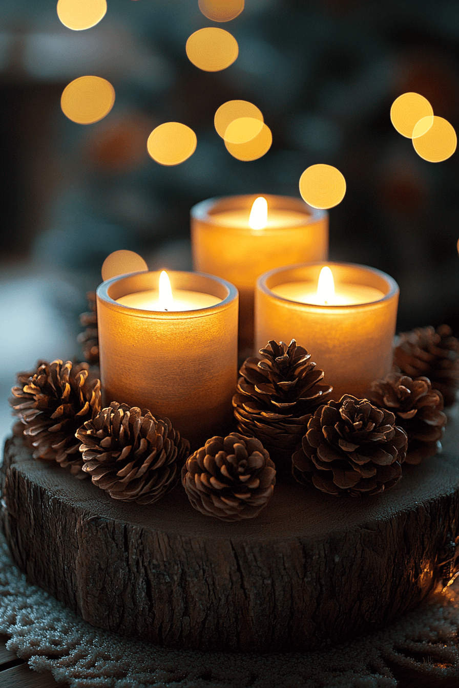 Pinecones and candles come together to form a rustic woodland wonderland full of natural texture and soft light. These Christmas candle decor ideas offer an inviting, cabin-like vibe that’s perfect for cozy winter nights. Layer them with wood slices and forest-inspired accents for an organic aesthetic. The result is warm, earthy, and utterly relaxing.