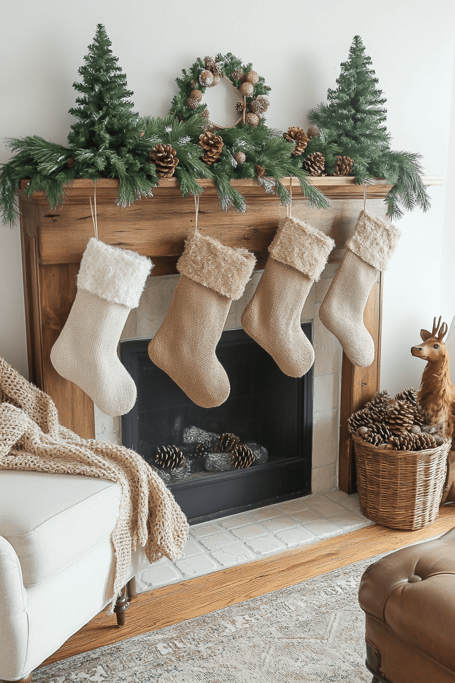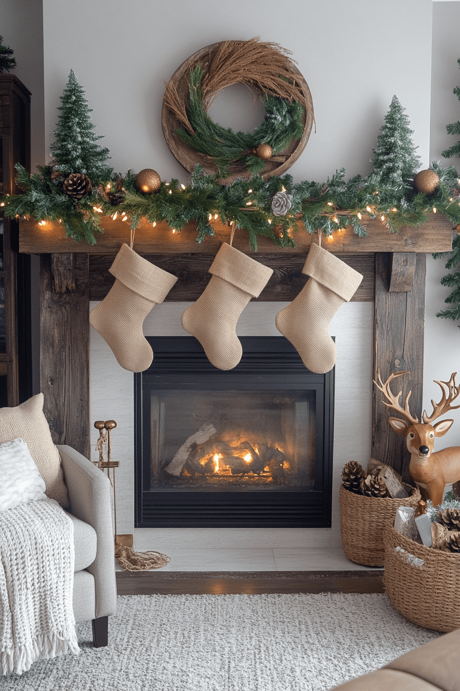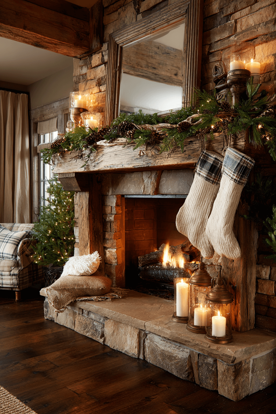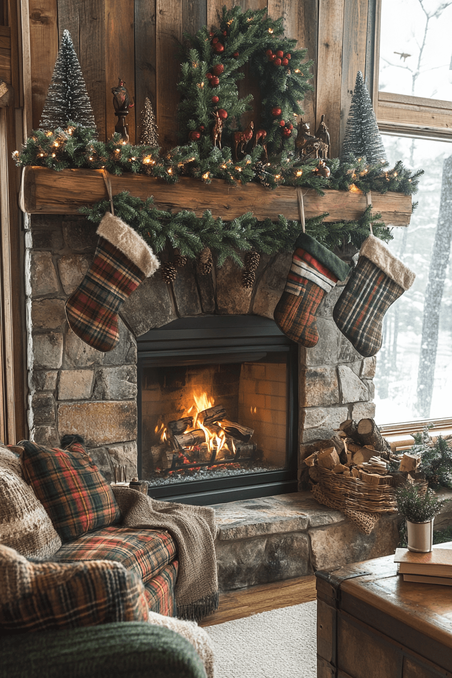 Channel the feel of a snowy lodge with cozy Christmas mantel decor featuring wood textures, knit stockings, and warm candlelight. Buffalo plaid and woven garlands add a rustic, homey feel to the scene. Every element invites you to snuggle up and enjoy the season. This look brings a cabin-inspired charm to any holiday setup.