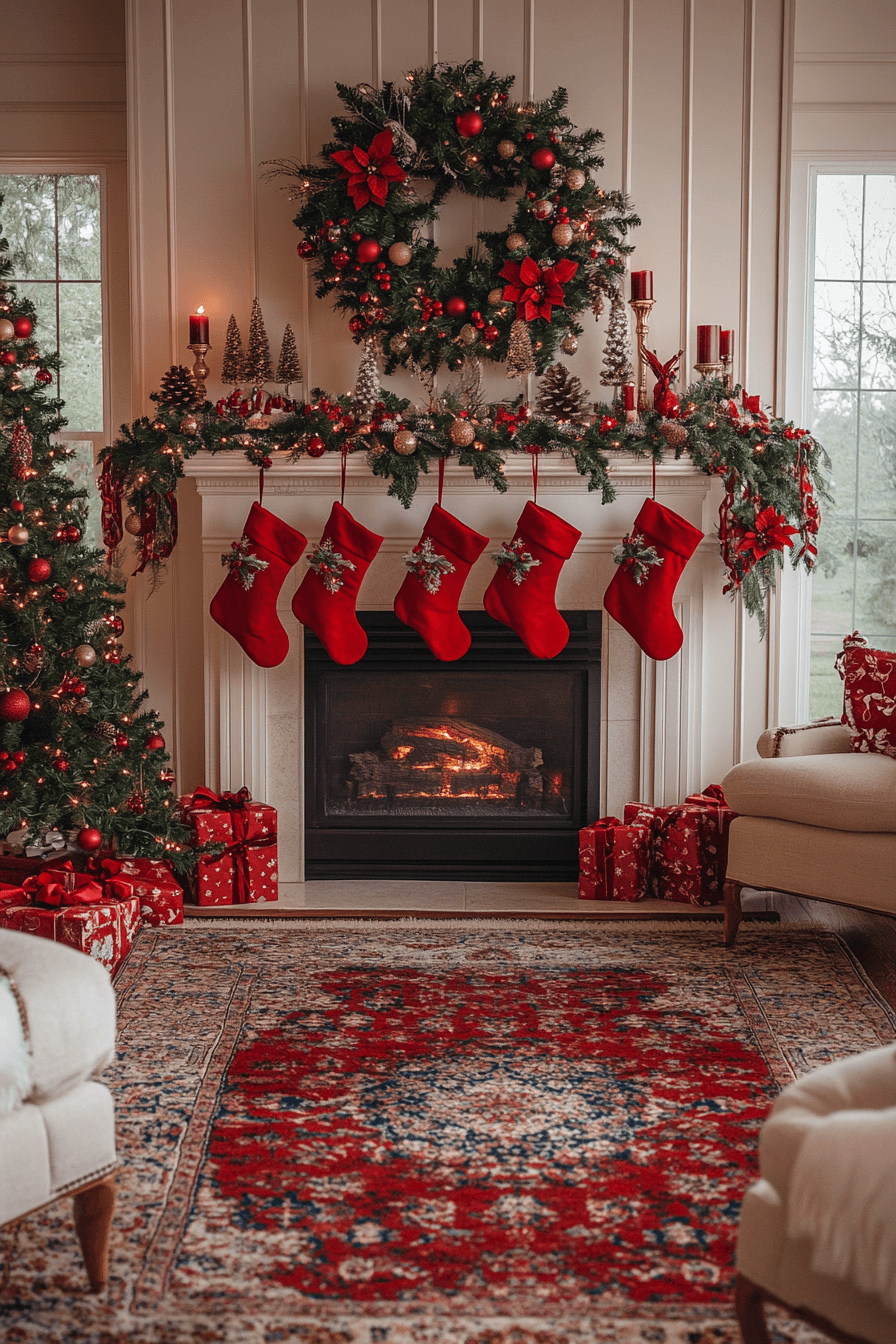 Celebrate timeless traditions with Christmas mantel decor filled with red, green, and gold accents. Layer lush garlands with holly, bows, and glowing candles to create a festive, classic look. Stockings hung with care and gold details add just the right amount of sparkle. This design captures the essence of beloved holiday memories.
