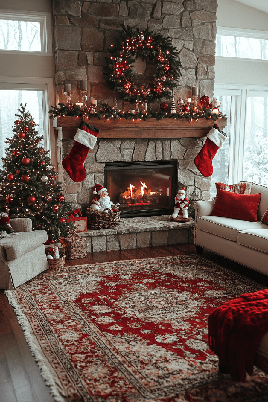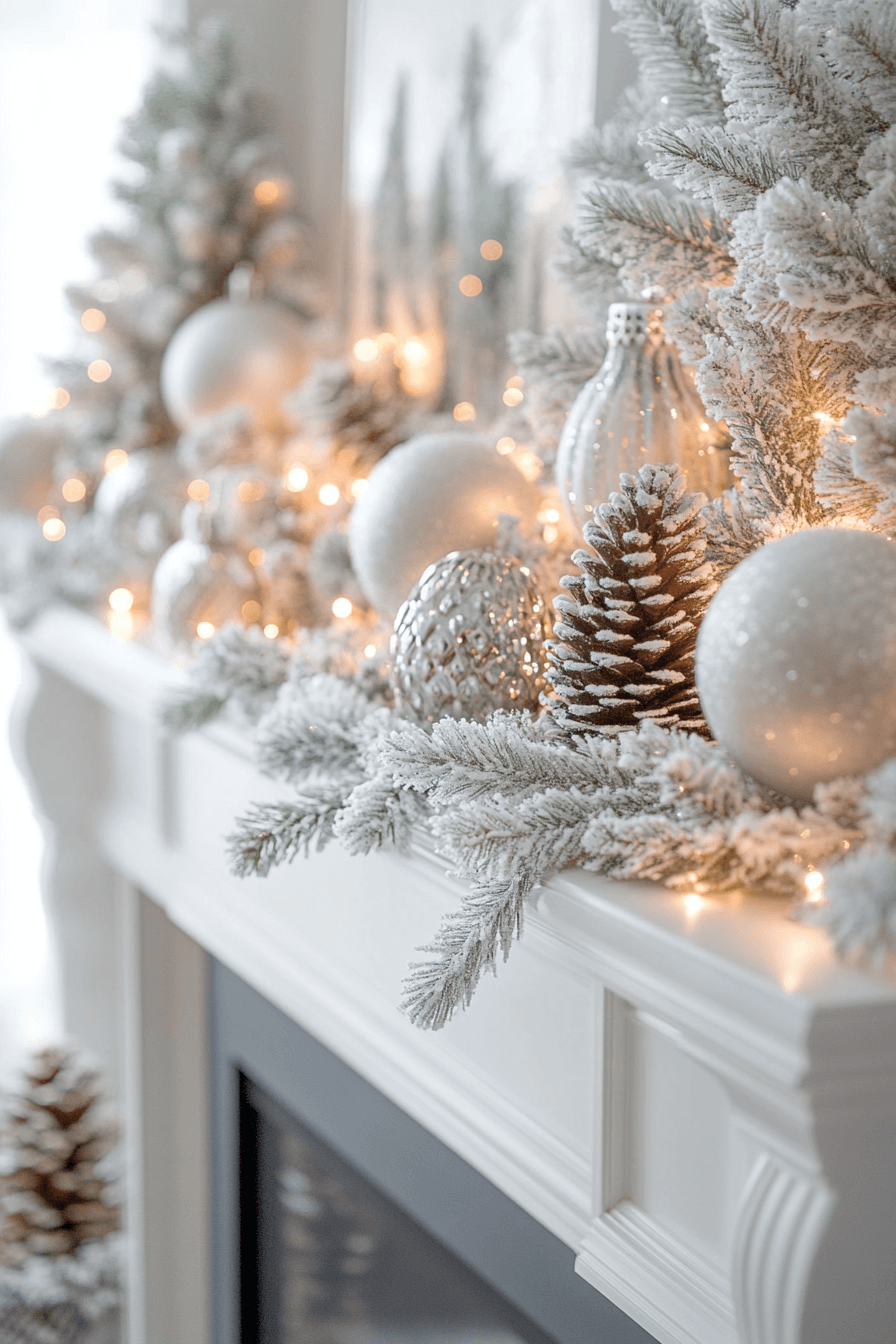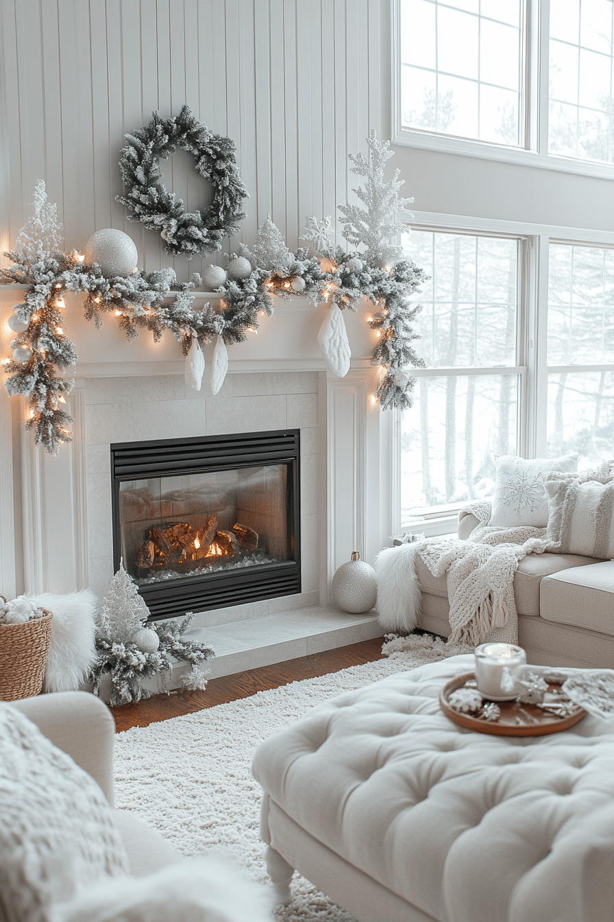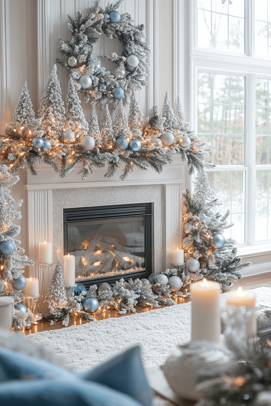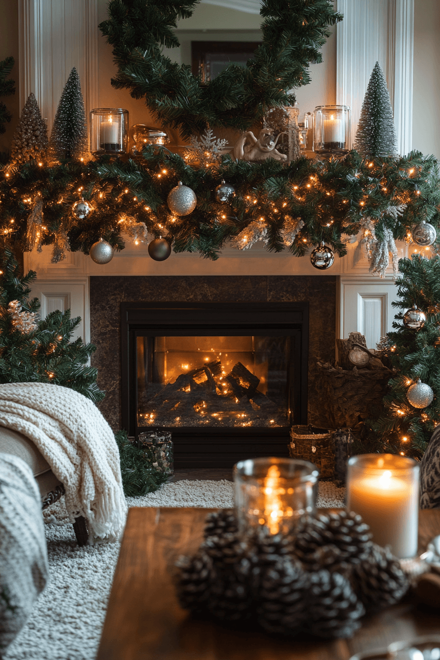 Turn your fireplace into a snowy retreat with Christmas mantel decor in cool whites and shimmering silvers. Use frosted pine garlands, glittering trees, and snowflake accents for a wintery vibe. Add twinkle lights and silver candlesticks for an extra dose of sparkle. This design feels like stepping into a peaceful snowy forest.
