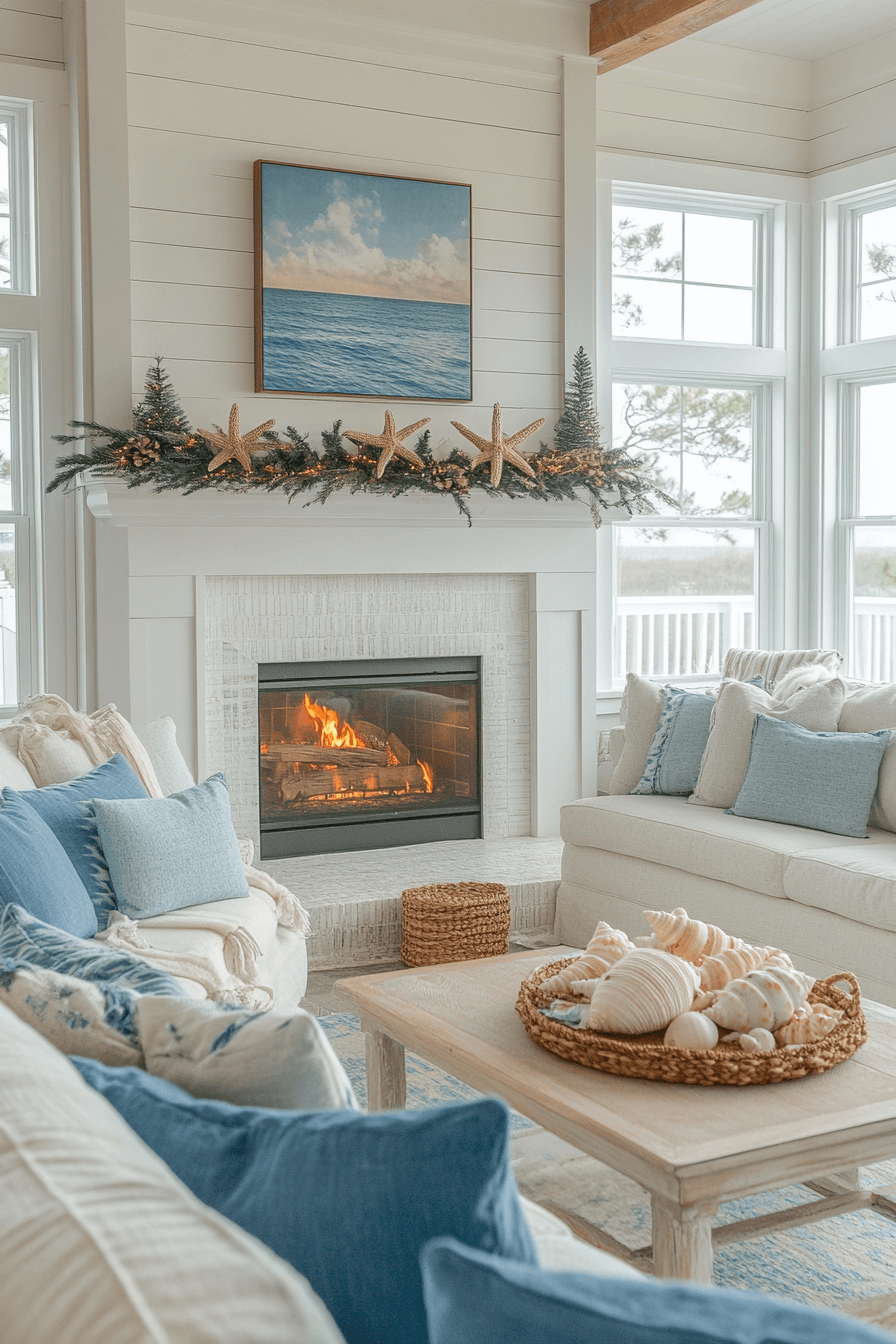 Channel seaside serenity with Christmas mantel decor that blends coastal charm with festive spirit. Use pale blues, shells, and driftwood to craft a breezy, beachy scene. Soft fabrics and airy textures keep things light and relaxed. It’s a unique take on traditional holiday style.