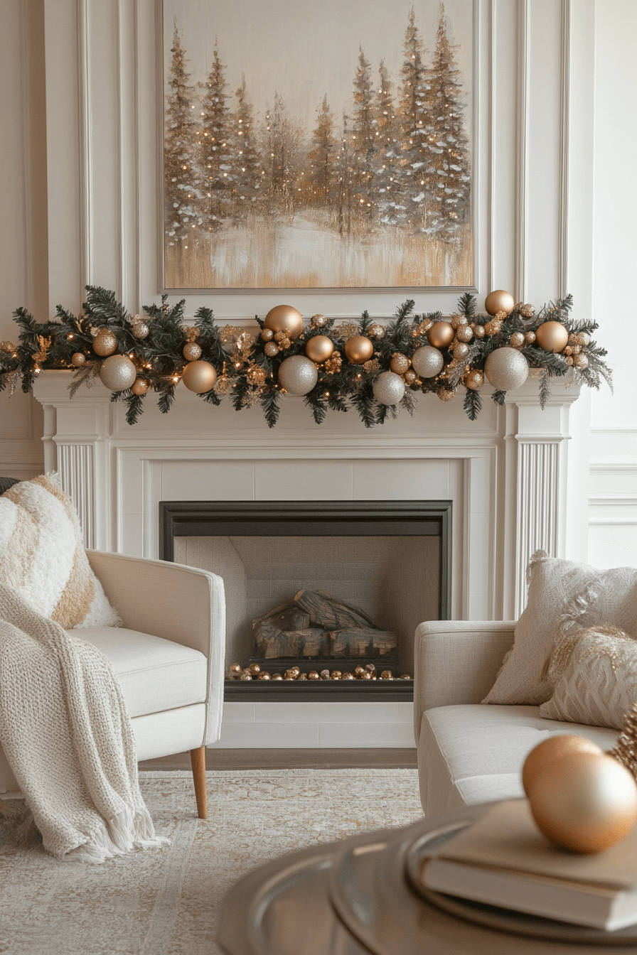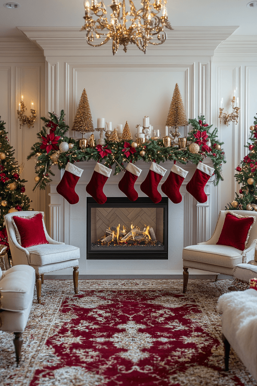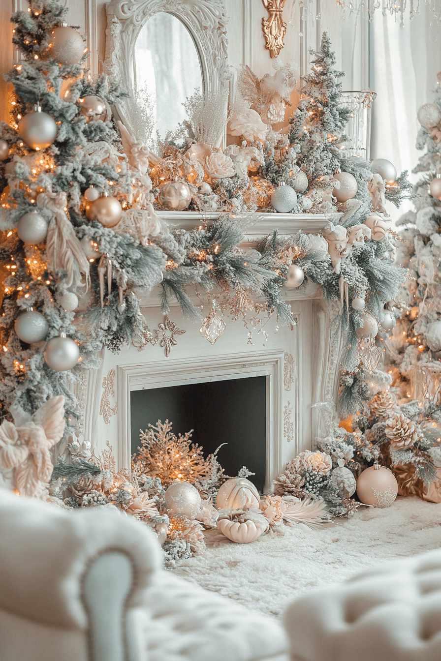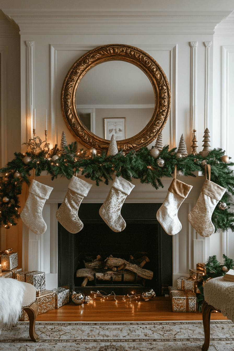 Elevate your home with Christmas mantel decor that sparkles with elegant golds, silvers, and champagne hues. Velvet stockings and crystal accents bring luxurious charm to your space. Paired with greenery and soft lighting, the result is both festive and refined. This timeless style is perfect for hosting or relaxing in style.