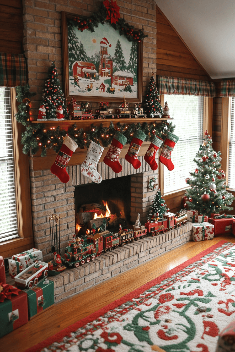 Step into the magic of the North Pole with playful Christmas mantel decor inspired by Santa’s Workshop. Add toy trains, candy canes, and cheerful figures for a fun, kid-friendly vibe. Bright colors and glowing lights make this style a favorite for families. Every detail sparks nostalgia and joy.