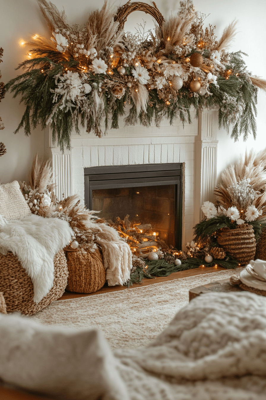 Get artsy and eclectic with boho Christmas mantel decor that mixes natural materials, earthy tones, and handmade charm. Use macramé, wooden beads, and woven textures for a relaxed holiday vibe. This non-traditional style blends rustic with free-spirited creativity. It’s perfect for those who want something cozy yet unique.