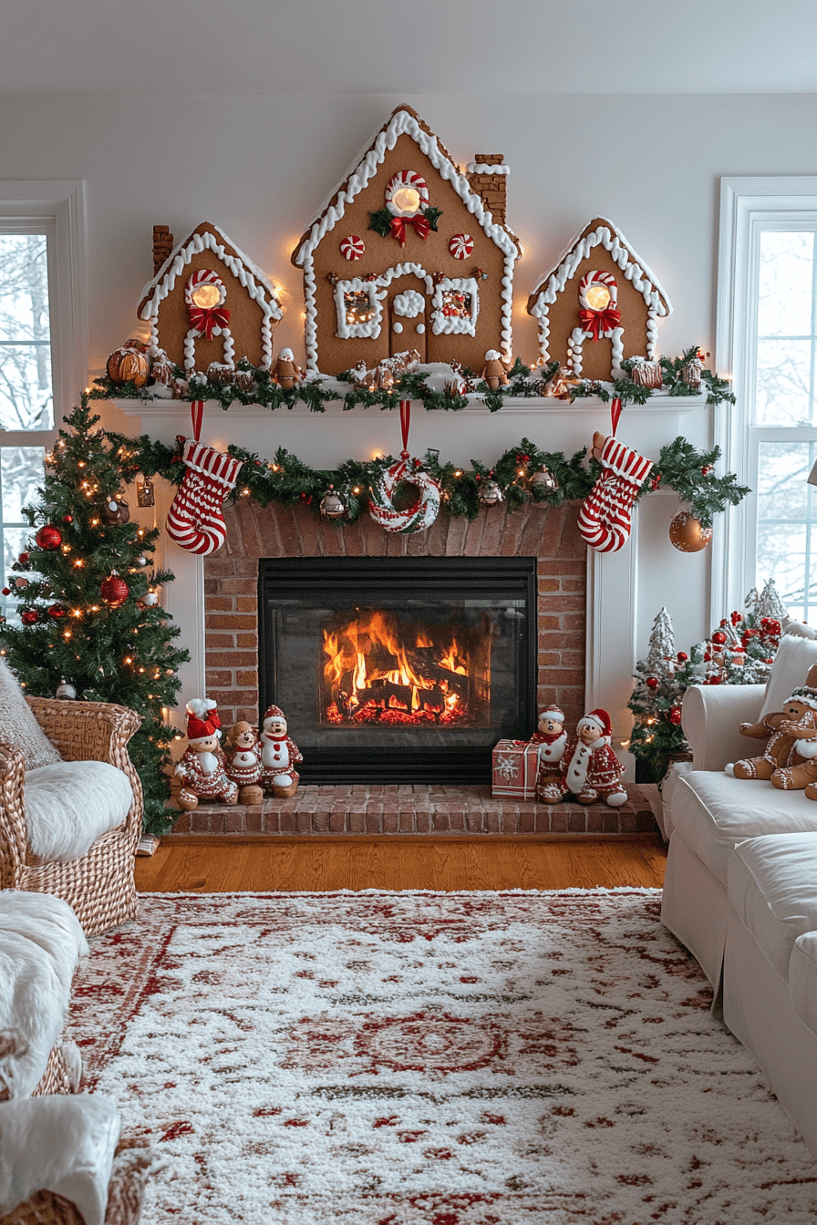 Celebrate the sweetness of the season with gingerbread-inspired Christmas mantel decor full of candy cane fun and gingerbread house figurines. Add red and green accents, faux snow, and glitter for a charming display. Every detail feels cheerful and playful. This style is great for kids or anyone young at heart.