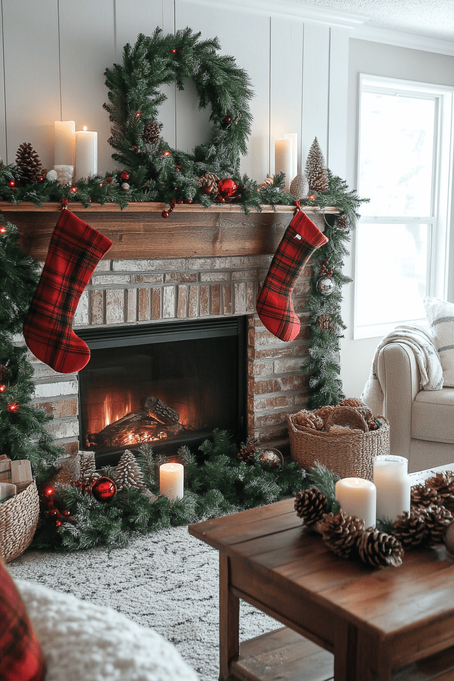 Classic plaid and fresh pine bring cozy cabin vibes to your Christmas mantel decor. Add ribbon, rustic wood accents, and natural greenery for a heartwarming setup. Pinecones and tartan bows add depth and texture. This timeless design feels like a warm hug on a snowy day.