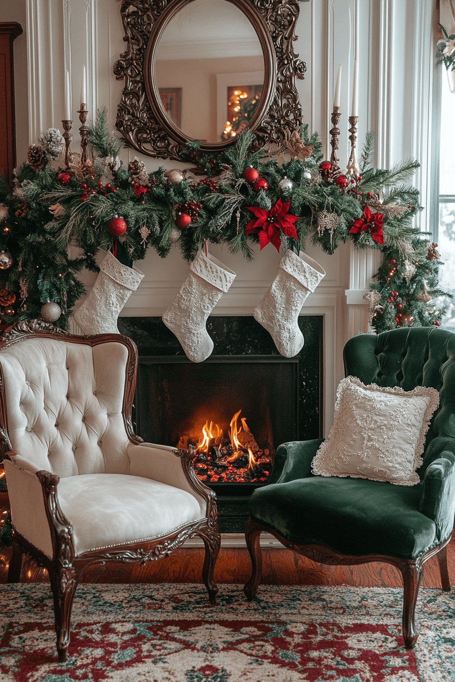Elegant and rich, Victorian-style Christmas mantel decor features deep reds, luxe greens, and golden details. Layer lace, ornate candle holders, and regal garlands for an old-world charm. This look exudes refinement and nostalgic grandeur. It’s ideal for those who appreciate history and timeless beauty.