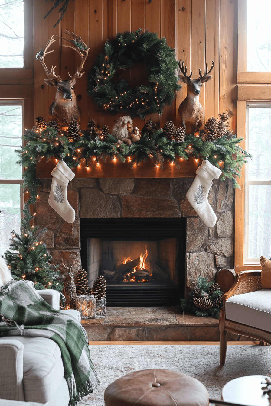 Bring the magic of the forest indoors with whimsical Christmas mantel decor that celebrates woodland beauty. Layer pine branches, mini critters, and rustic garlands for an enchanting touch. Add twinkling lights and pinecones to complete this natural, playful theme. This look is great for those who love a storybook-style Christmas.