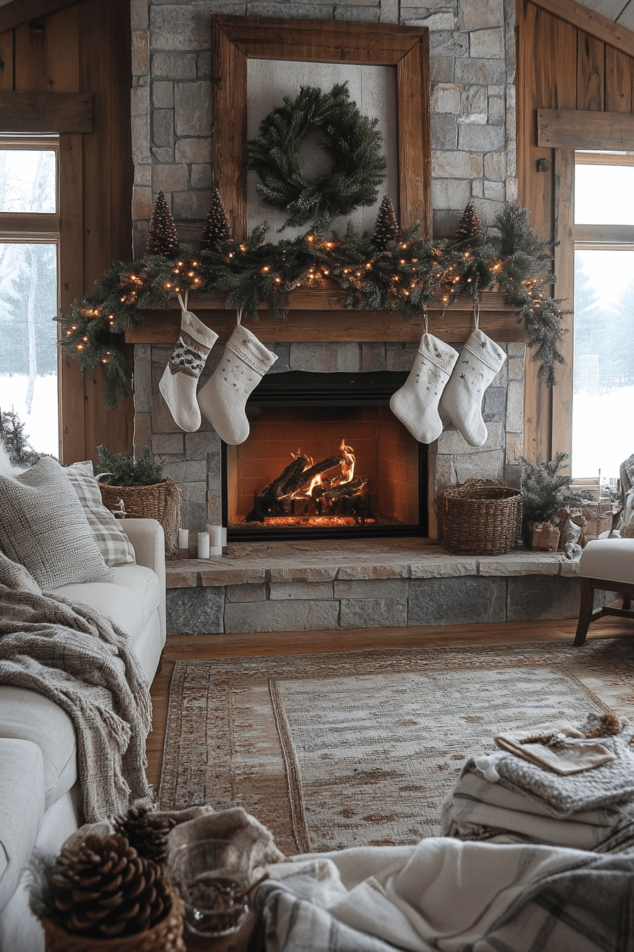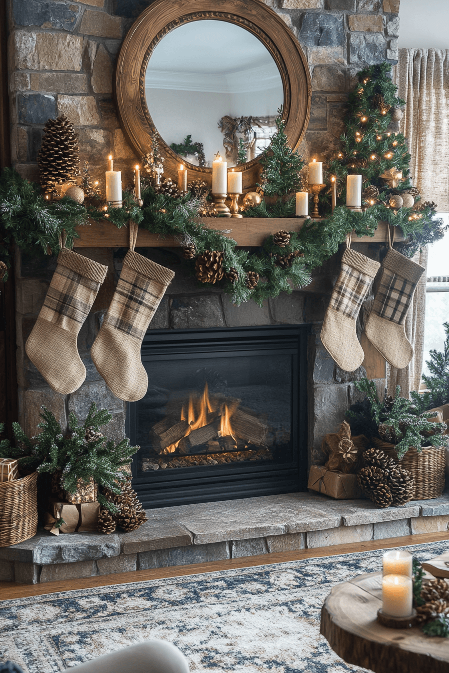 Rustic charm comes alive with Christmas mantel decor crafted from natural woods, pinecones, and soft plaid accents. The warm textures and organic tones create a cozy, cabin-like feel that radiates comfort. Gentle candlelight or lantern glow enhances the nostalgic beauty of the scene. Every detail feels heartfelt and welcoming. Let rustic charm wrap your home in warmth and start your holidays on a comforting note.