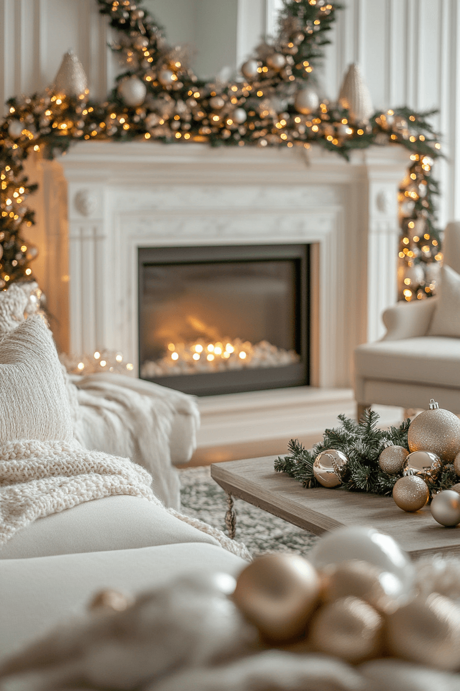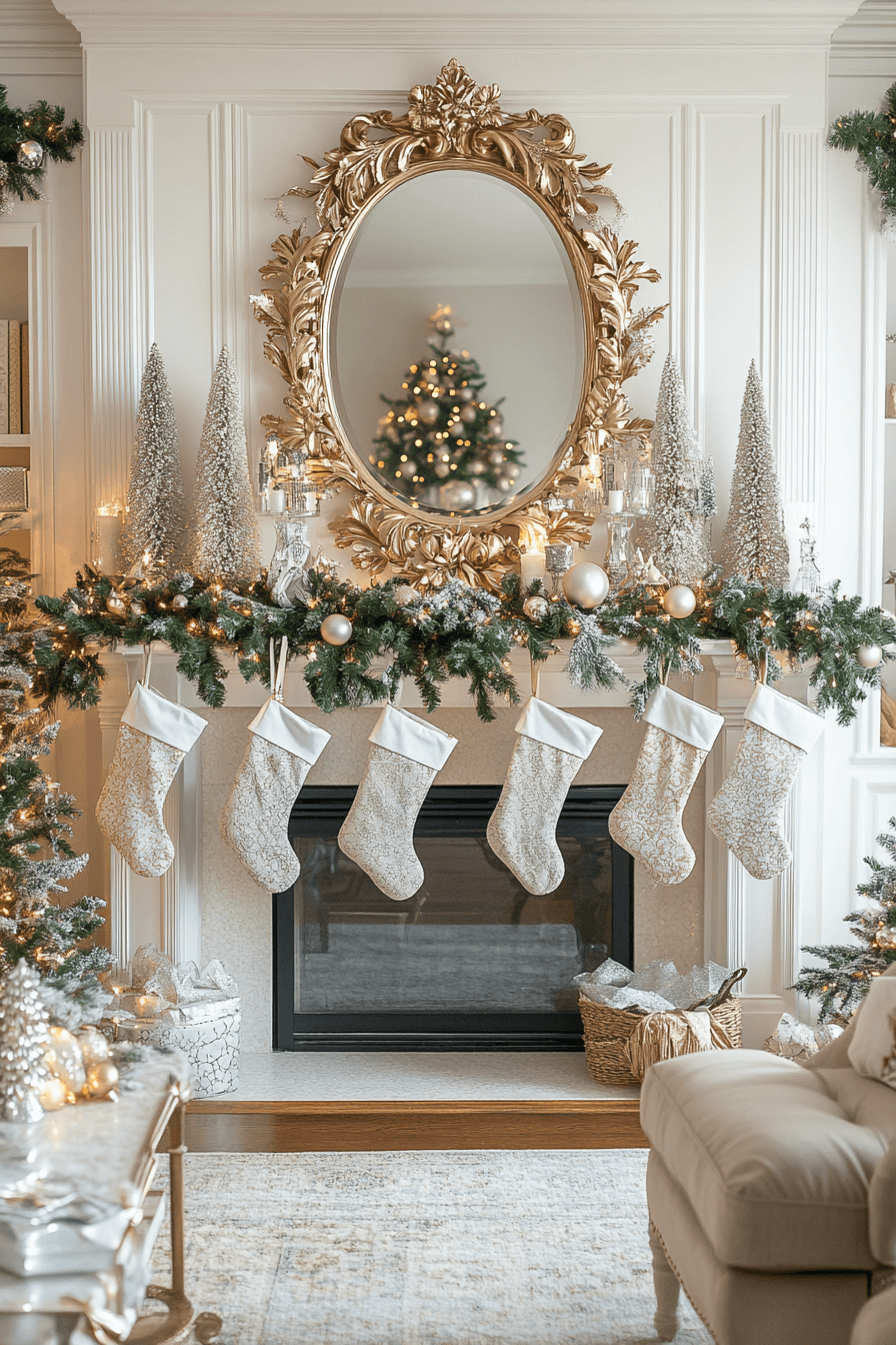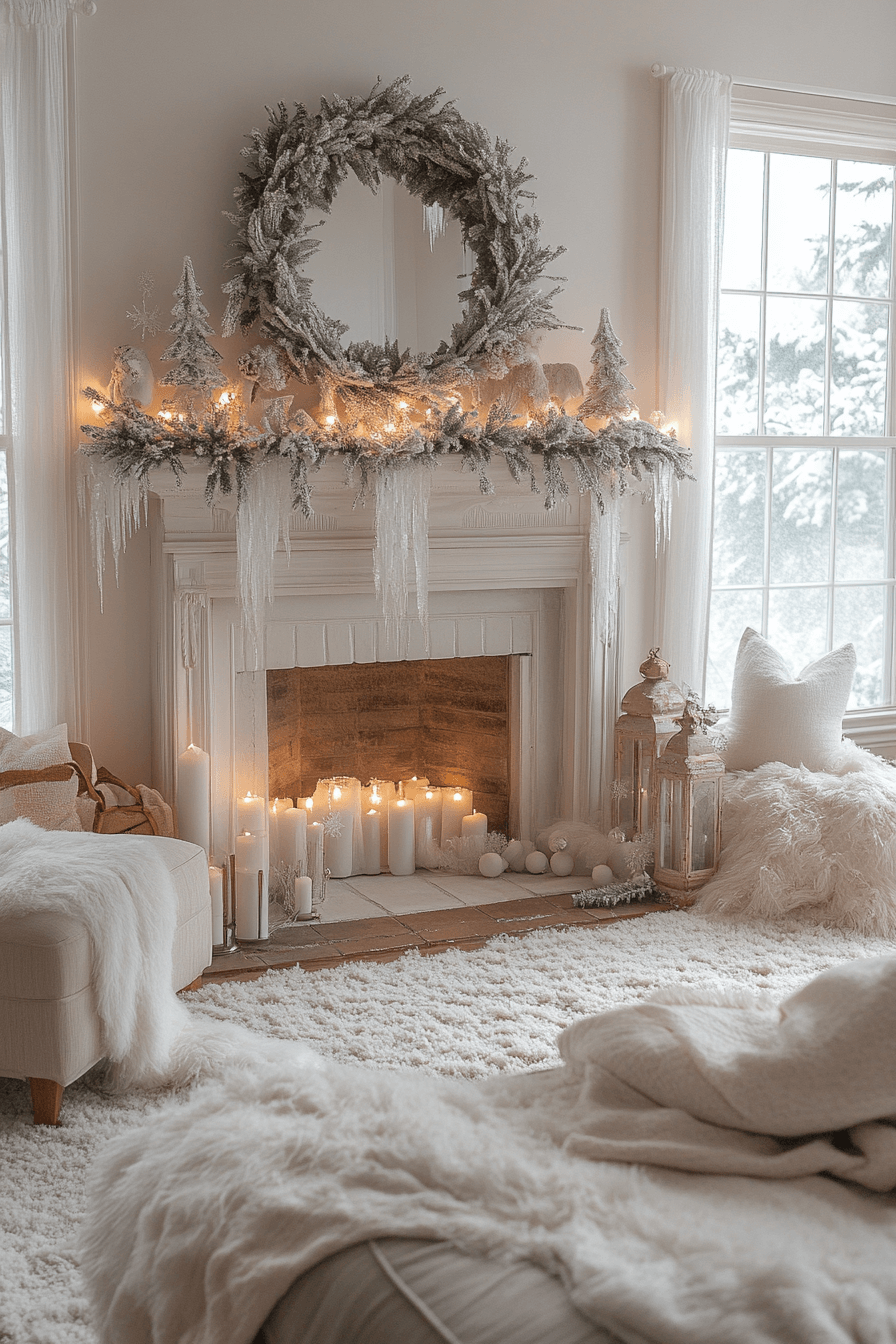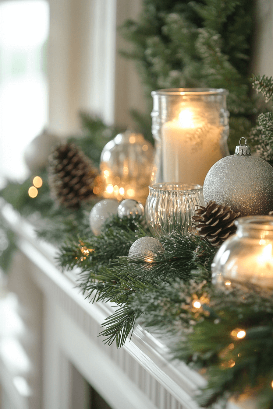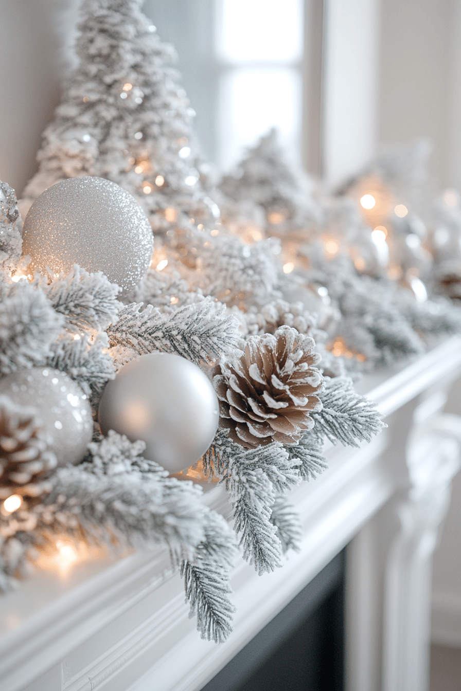 Snowy whites, silvers, and frosted greenery make this Christmas mantel decor look straight out of a wintry forest. The palette evokes peace, elegance, and gentle sparkle. Every detail shimmers softly, capturing the quiet beauty of snow. It’s delicate, refined, and calming. Turn your home into a frosted wonderland and let tranquility take center stage.
