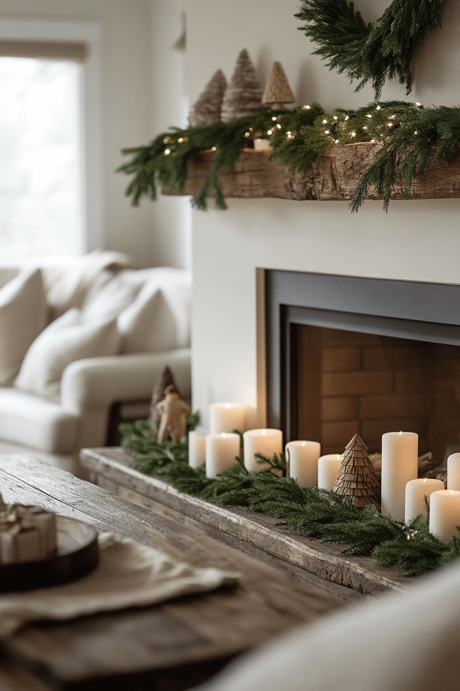 Neutral tones and sleek candles give this minimalist Christmas mantel decor modern sophistication. Every detail is intentional, elegant, and balanced. The uncluttered design lets texture and light take the spotlight. It’s simple, stylish, and calming. Redefine elegance this season and let simplicity elevate your space.