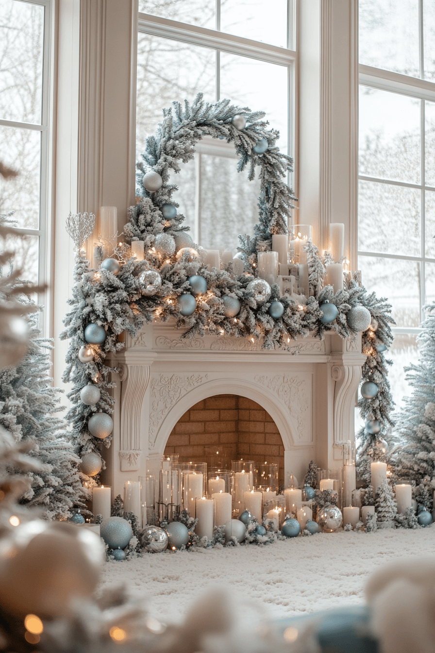 Bring the beauty of snowfall indoors with Christmas mantel decor inspired by a winter wonderland. Frosted pine, shimmering silver, and icy blues glisten like fresh snow under moonlight. The look feels calm, elegant, and dreamlike. It’s a soothing escape filled with wintry sparkle. Transform your home into a peaceful snow-kissed haven that dazzles with frosty serenity.