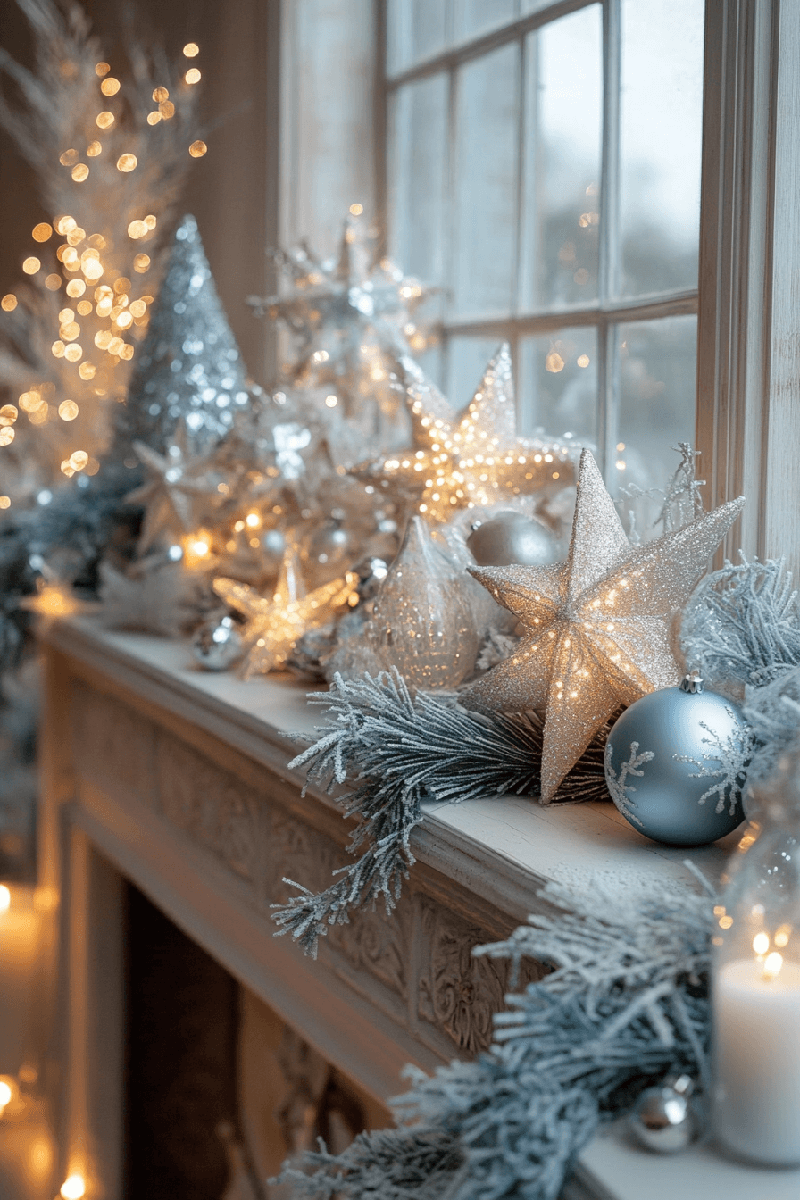 Golden stars, shimmering garlands, and delicate candles bring celestial glow to this radiant Christmas mantel decor. The mix of metallic tones sparkles softly against the evening light. It’s elegant, dreamy, and full of magic. Every shine feels otherworldly. Turn your home into a starlit celebration and let your mantel twinkle with wonder.