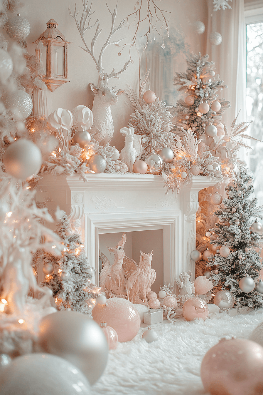 Soft pastels, crystal ornaments, and shimmering fairy lights make this ethereal Christmas mantel decor feel truly magical. Gentle textures and dreamy hues create a peaceful, imaginative atmosphere. The look balances whimsy with elegance. It’s straight out of a fairytale. Bring fantasy to life this Christmas and let your mantel glow with enchantment.