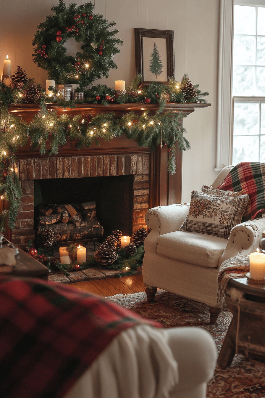 Plaid ribbons, pine branches, and rustic textures define this timeless, cozy Christmas mantel decor. The rich pattern adds instant warmth and personality. Every layer feels classic yet inviting. It’s festive simplicity at its best. Infuse your home with plaid perfection and wrap your mantel in nostalgic cheer.