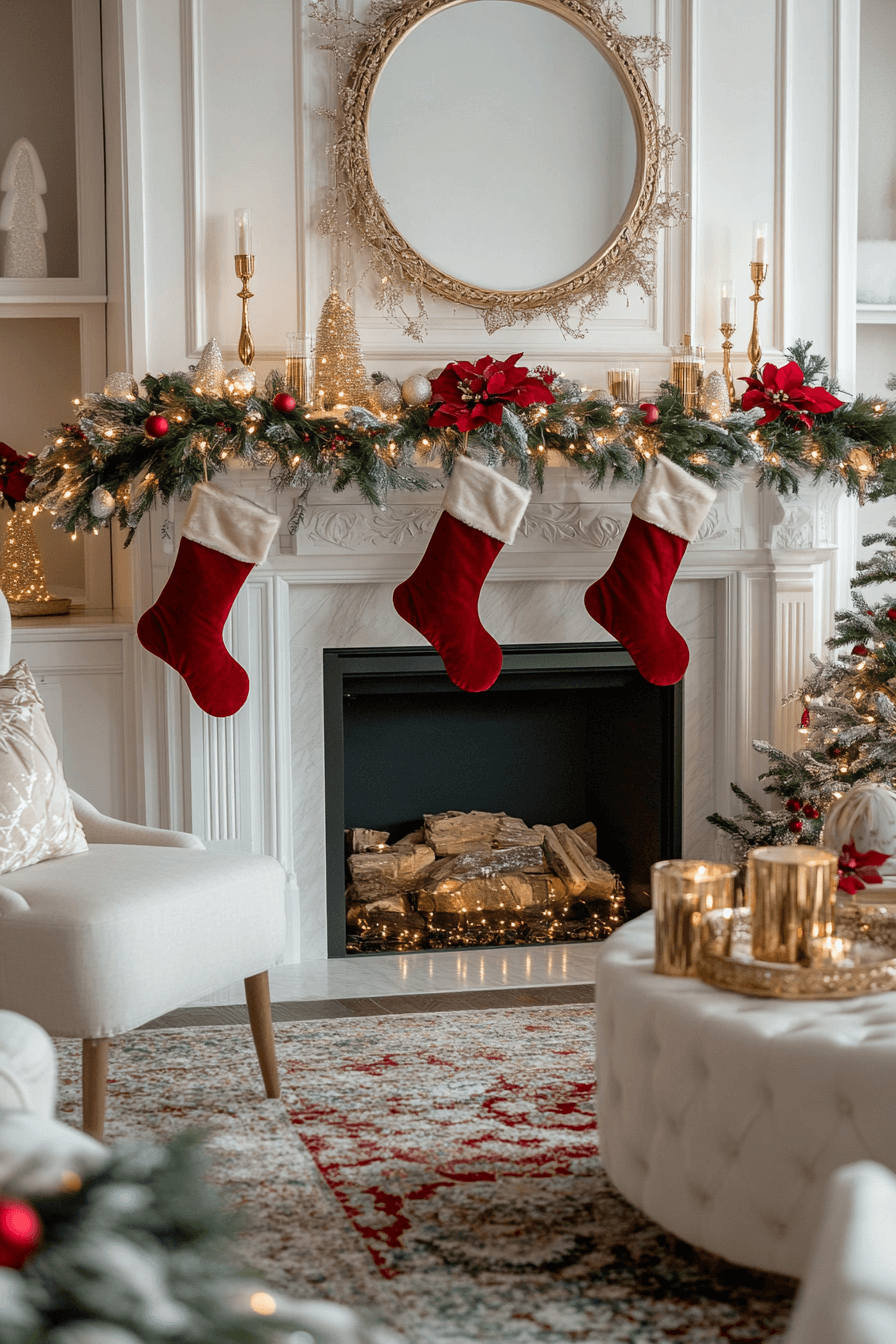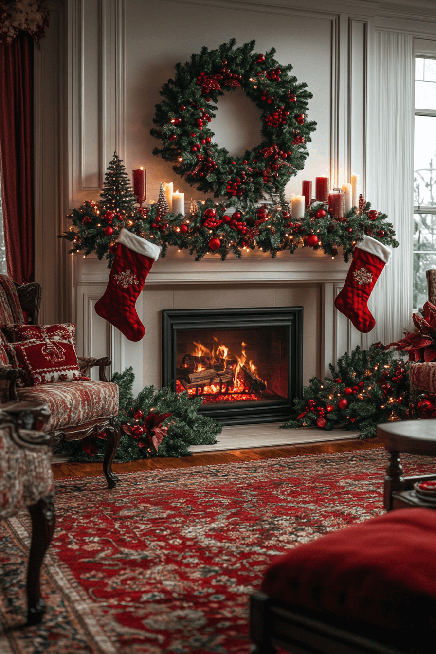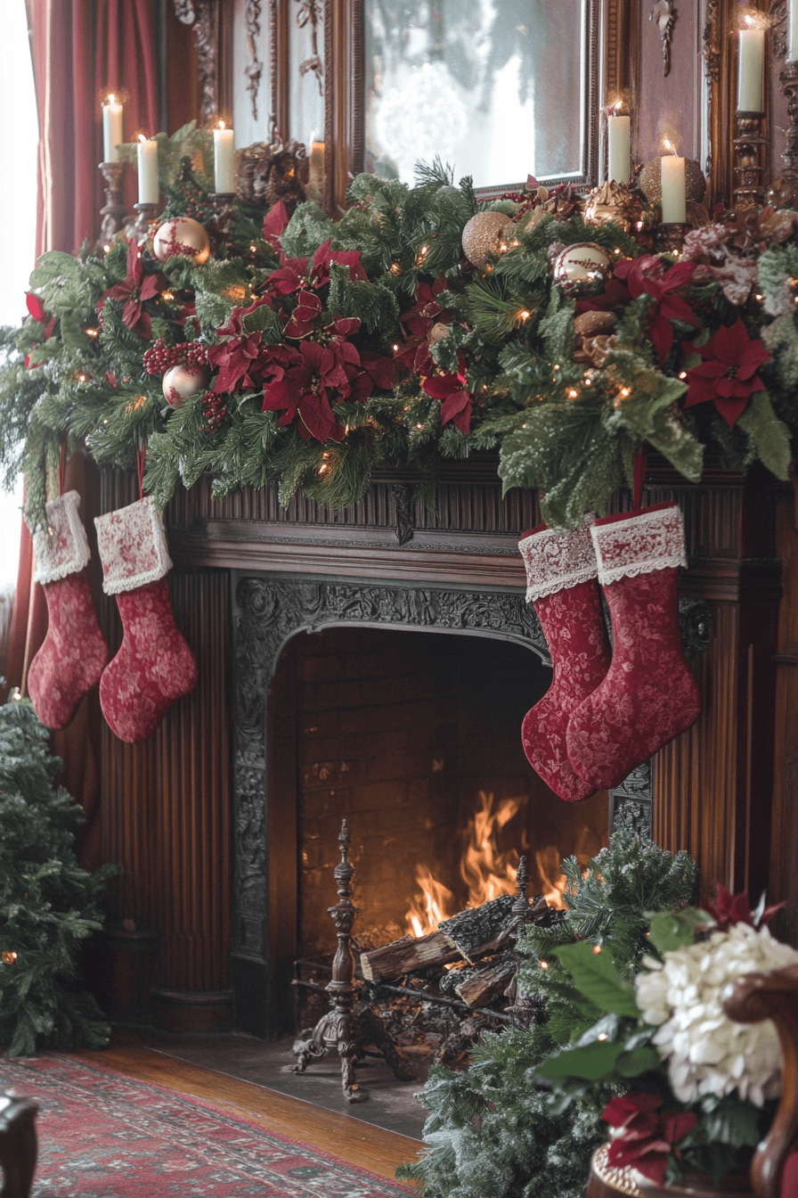 Deep greens, reds, and gold accents evoke the splendor of a bygone era in this Victorian-style Christmas mantel decor. Ornate candleholders and lace-trimmed stockings enhance its vintage elegance. The effect is regal yet romantic. Every detail whispers luxury. Add old-world grandeur to your home and let your mantel shine with timeless beauty.