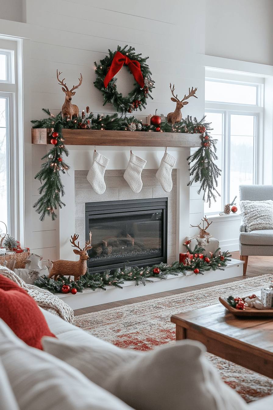 Whimsical forest creatures, pinecones, and lush greenery create a magical woodland version of Christmas mantel decor. Tiny twinkling lights and woodsy textures add depth and playfulness. The entire setup feels natural yet enchanting. It’s joyful, earthy, and full of wonder. Bring nature’s magic indoors and make your mantel feel like a storybook forest.