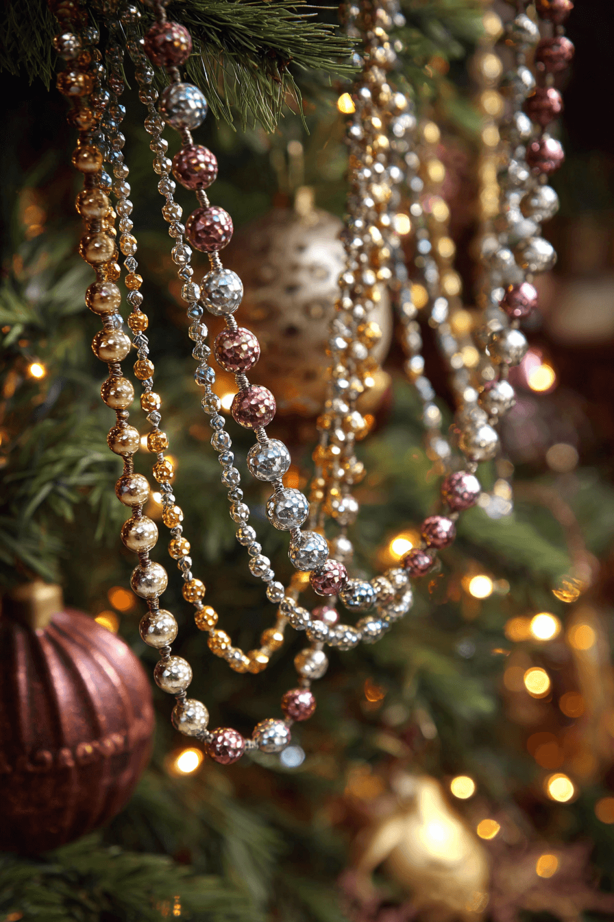 Beaded garland Christmas ornaments add texture, movement, and sparkle to your holiday setup. Whether wrapped around your tree or draped across mantels, these shimmering strands tie everything together. They catch the light and create a festive rhythm with every curve. These accents are perfect for any style, from boho to glam.