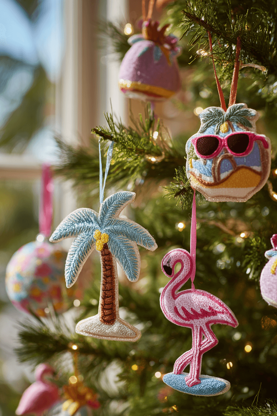 Beach-themed Christmas ornaments bring tropical sunshine to your tree with palm leaves, surfboards, and seashells. They’re perfect for coastal homes or warm-weather Christmas celebrations. These ornaments infuse your decor with a light, breezy vibe that feels like a holiday vacation. Combine with soft blues and sandy hues for full effect.