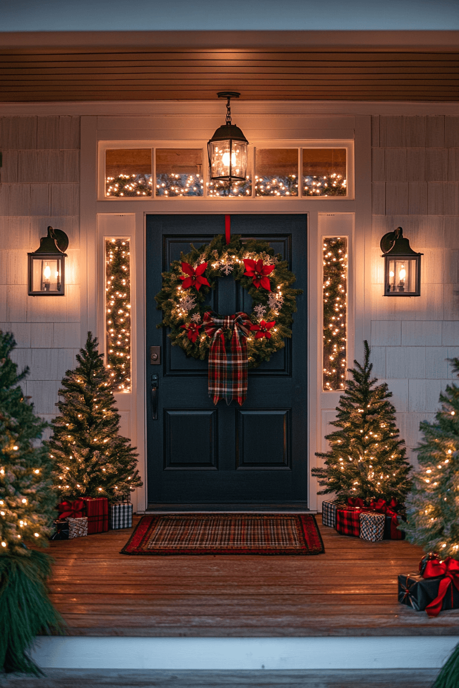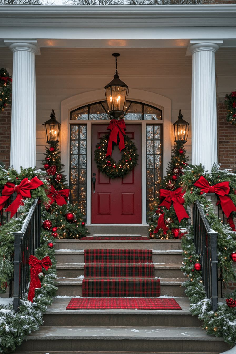 Celebrate timeless tradition with classic Christmas porch decor in red, green, and plaid. Think wreaths with big red bows, cozy plaid ribbons, and evergreen accents to bring nostalgic charm. Add a themed doormat or matching holiday signs for extra festive spirit. This design brings warmth and tradition to your doorstep.