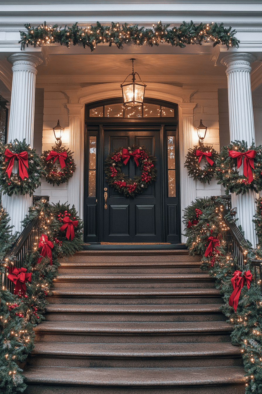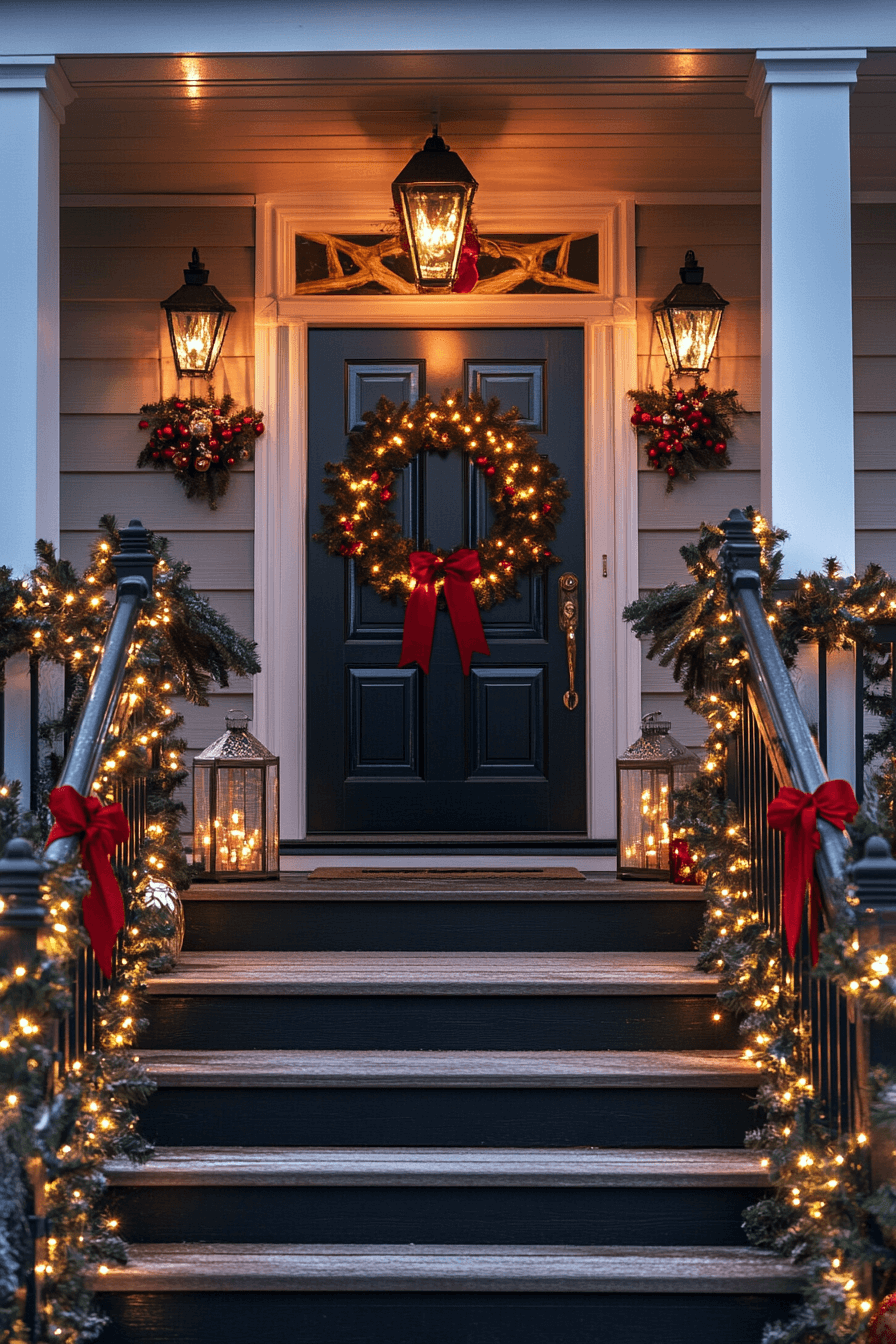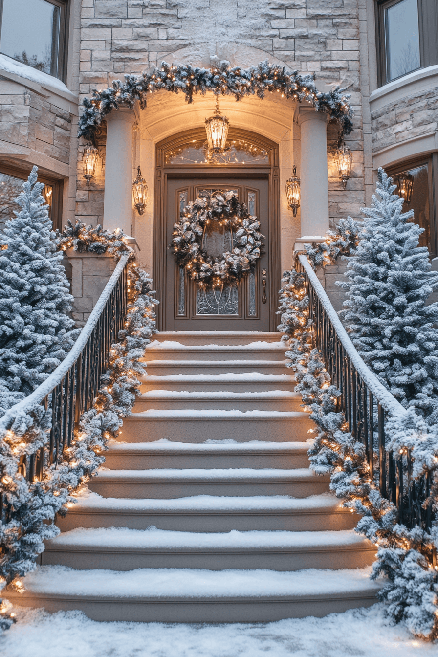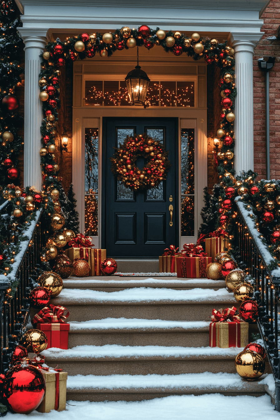 Enhance your entrance with a refined, graceful touch using a staircase-focused Christmas porch decor theme. Wrap garlands with delicate ribbons along railings and add soft lighting for a beautiful cascading effect. Complete the look with oversized ornaments or a statement wreath. It’s a sophisticated style that blends elegance with festive spirit.