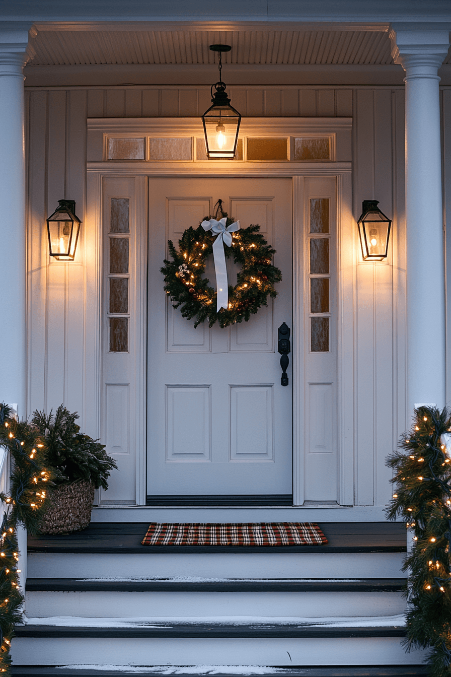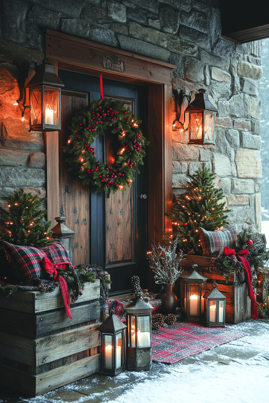 Wrap your front steps in warmth with glowing Christmas porch decor full of amber lights and cozy vibes. Use string lights, lanterns, and soft accents to create a space that feels like a holiday retreat. This warm, golden glow invites guests in with comfort and joy. It’s the perfect way to soften the winter chill.