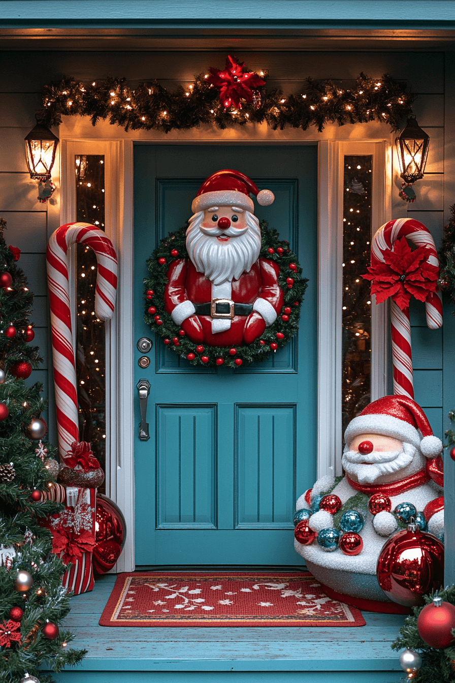 Add a playful twist to your entry with candy cane Christmas porch decor. Use bold red-and-white stripes in wreaths, lights, and decor pieces to mimic sweet holiday treats. Oversized candy canes and peppermint props make it feel straight from Santa’s workshop. This cheerful look is perfect for families with young kids—or anyone young at heart.