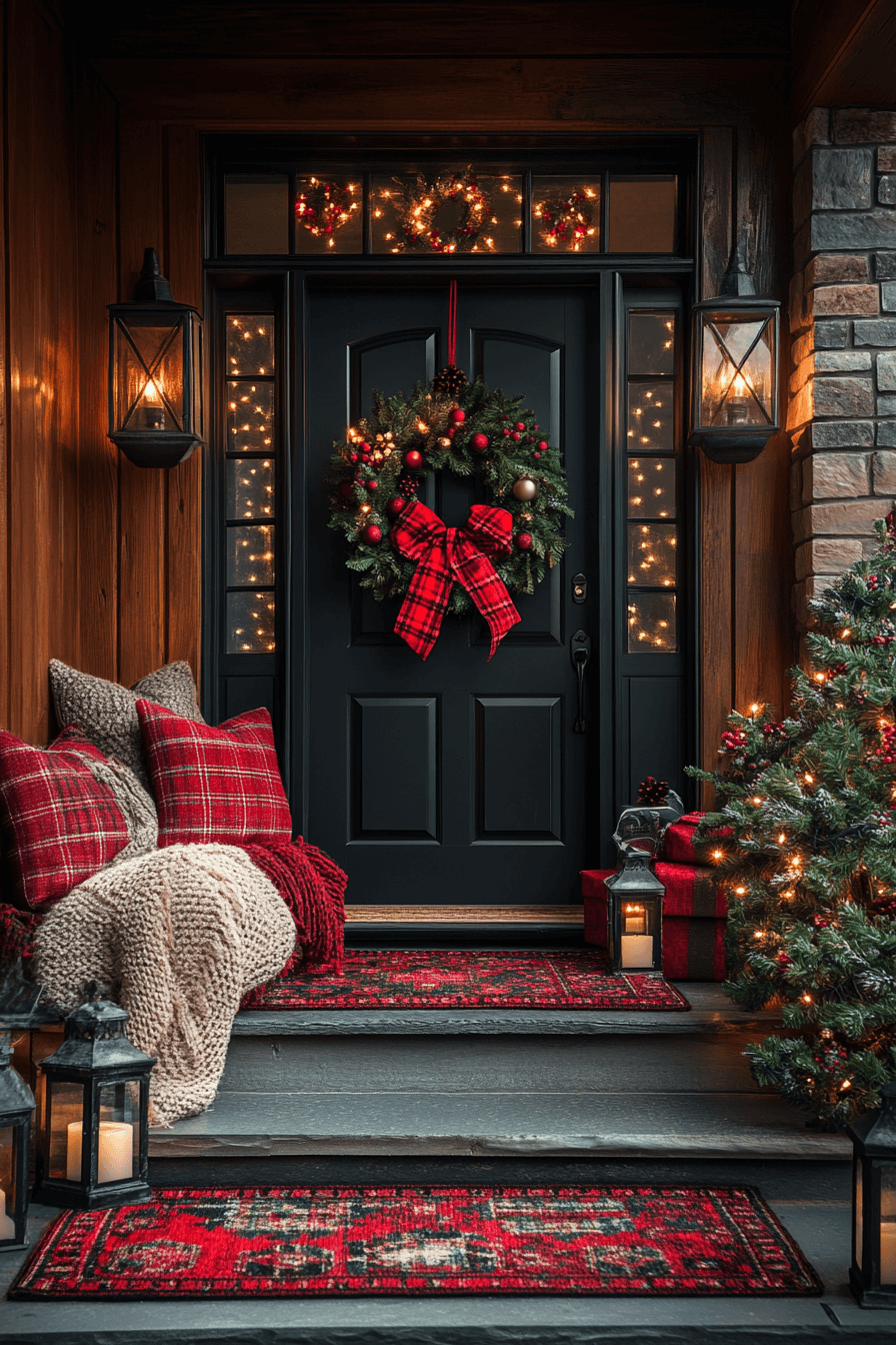 Warmth and comfort take center stage with cozy Christmas porch decor featuring plush blankets, festive pillows, and glowing lanterns. Red and green accents paired with neutral tones create a soothing, homey vibe. A glowing wreath and gentle lights invite loved ones in with holiday charm. This setup is perfect for relaxed, heartfelt gatherings.