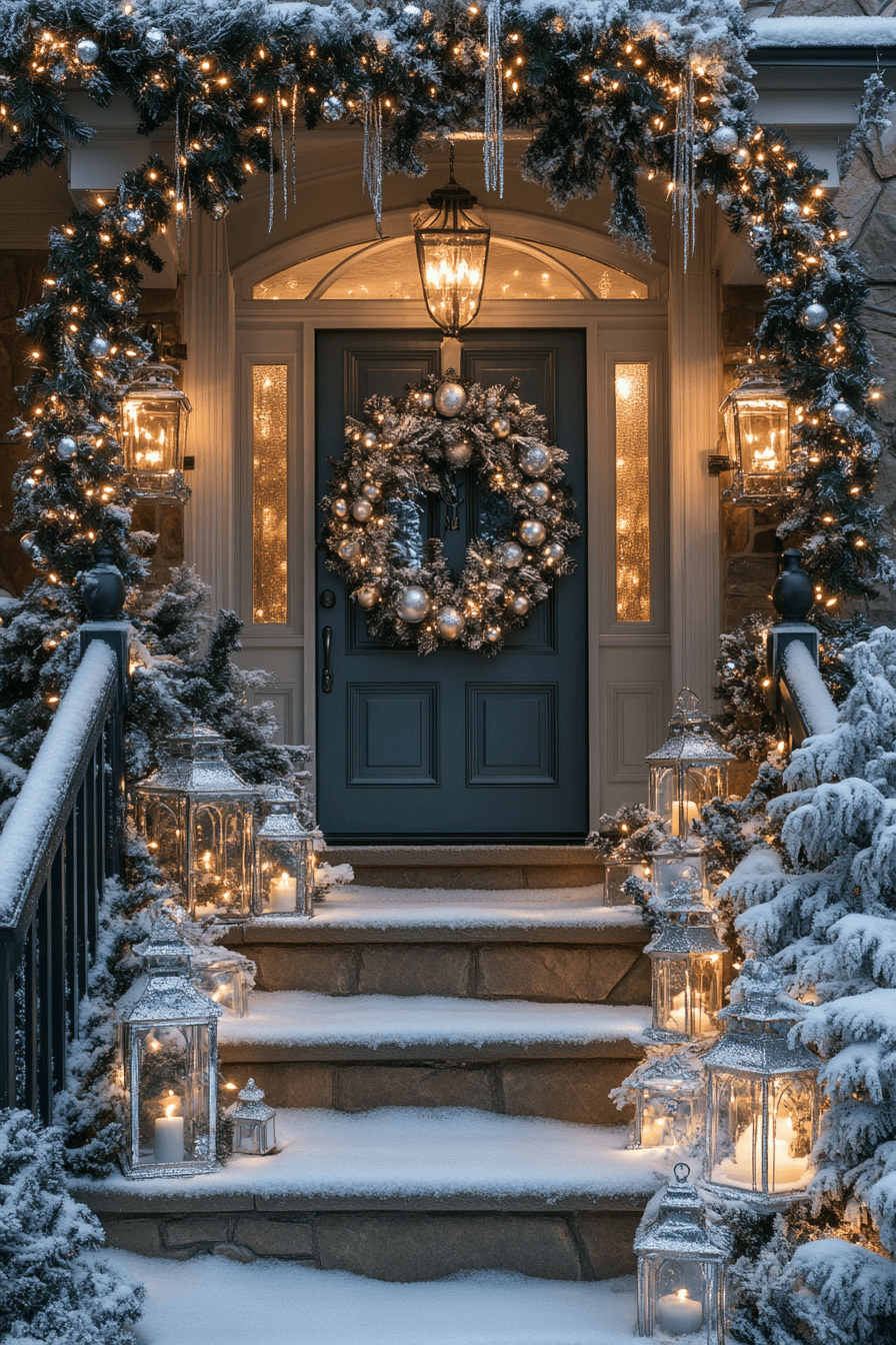 Add a touch of grandeur with luxury-themed Christmas porch decor that sparkles with elegance. Use crystal-adorned wreaths, gold accents, and upscale lanterns to create a posh presentation. Rich textures and metallics turn your entrance into a five-star holiday showcase. This look delivers serious wow factor.