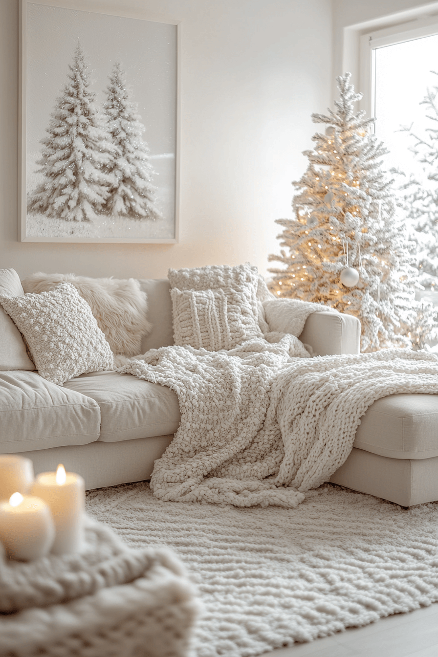 Whites on whites create a dreamy escape when you decorate with cozy Christmas decor that mimics freshly fallen snow. From white garlands to faux fur stockings, everything feels soft, pure, and peaceful. Accent with silver or champagne for a sophisticated sparkle. This aesthetic is clean yet comforting, modern yet timeless.