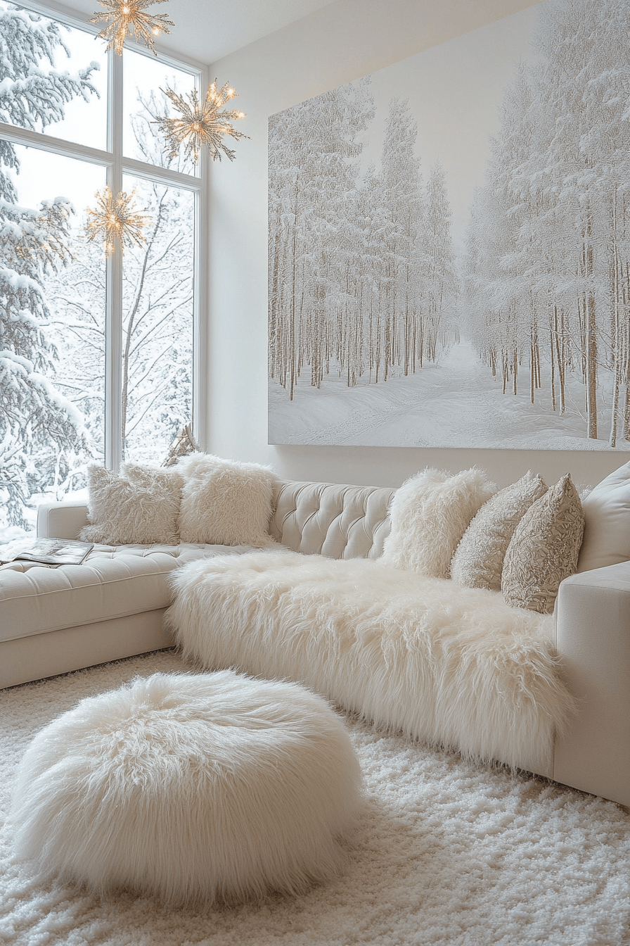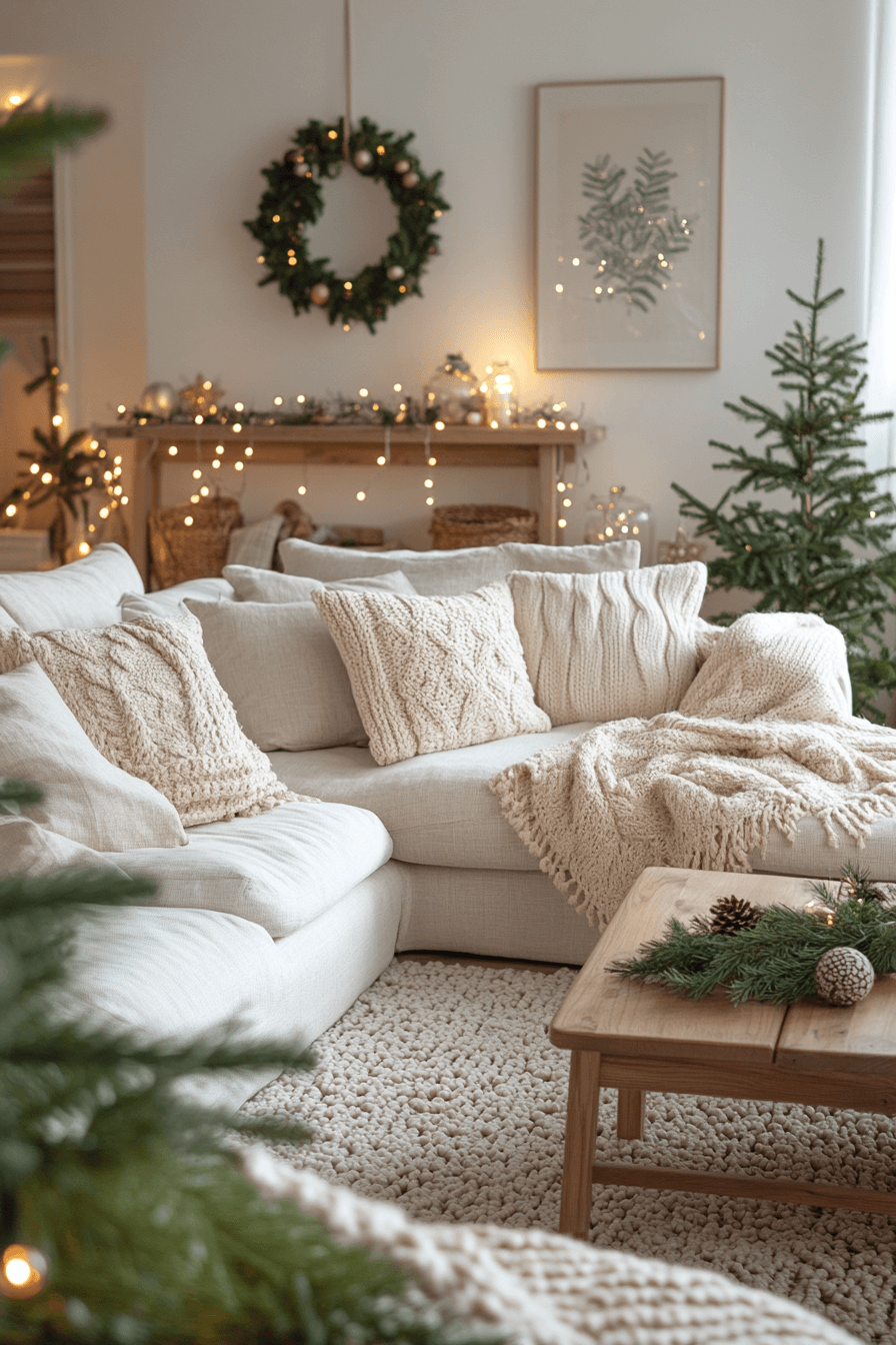 White tones and gentle lighting make this cozy Christmas decor feel like a serene snow cloud come to life. Plush fabrics and delicate ornaments bring softness and sparkle to your space. The simplicity highlights elegance while keeping things warm and inviting. Every glow feels pure and tranquil. Drift into a world of white serenity and let calm elegance define your holiday.