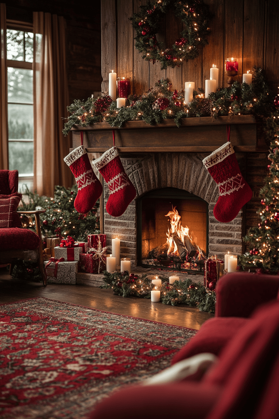 Flickering flames and gentle garlands define this heartwarming display of cozy Christmas decor. Soft stockings and glowing candles invite connection and comfort. The atmosphere feels intimate and joyful, perfect for gathering with loved ones. It’s nostalgia at its coziest. Curl up by the glow and let your home embrace you with fireside charm.