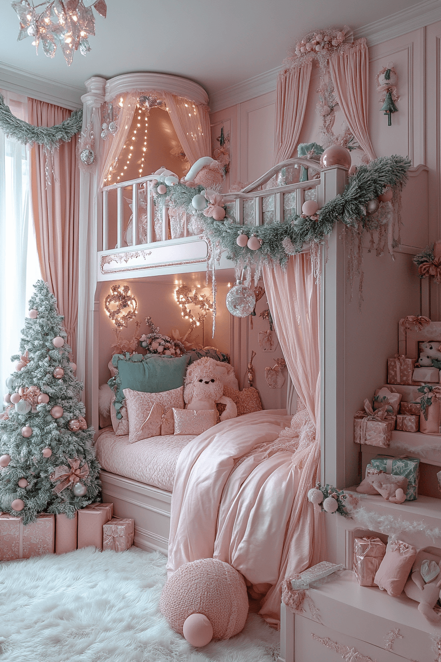 Soft pinks, delicate whites, and dreamy shimmer create a sweet fairytale mood in this cozy Christmas decor. Every light flickers like a sugar-dusted memory. The pastel palette feels whimsical, feminine, and full of wonder. It’s a vision straight from a storybook celebration. Let your inner dreamer shine and make your holiday sparkle with magic.