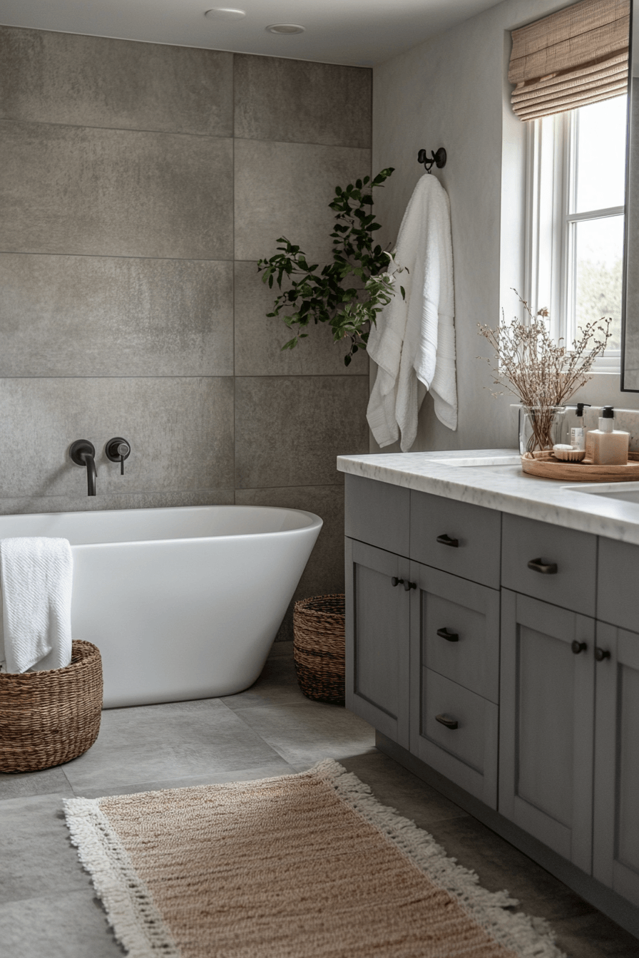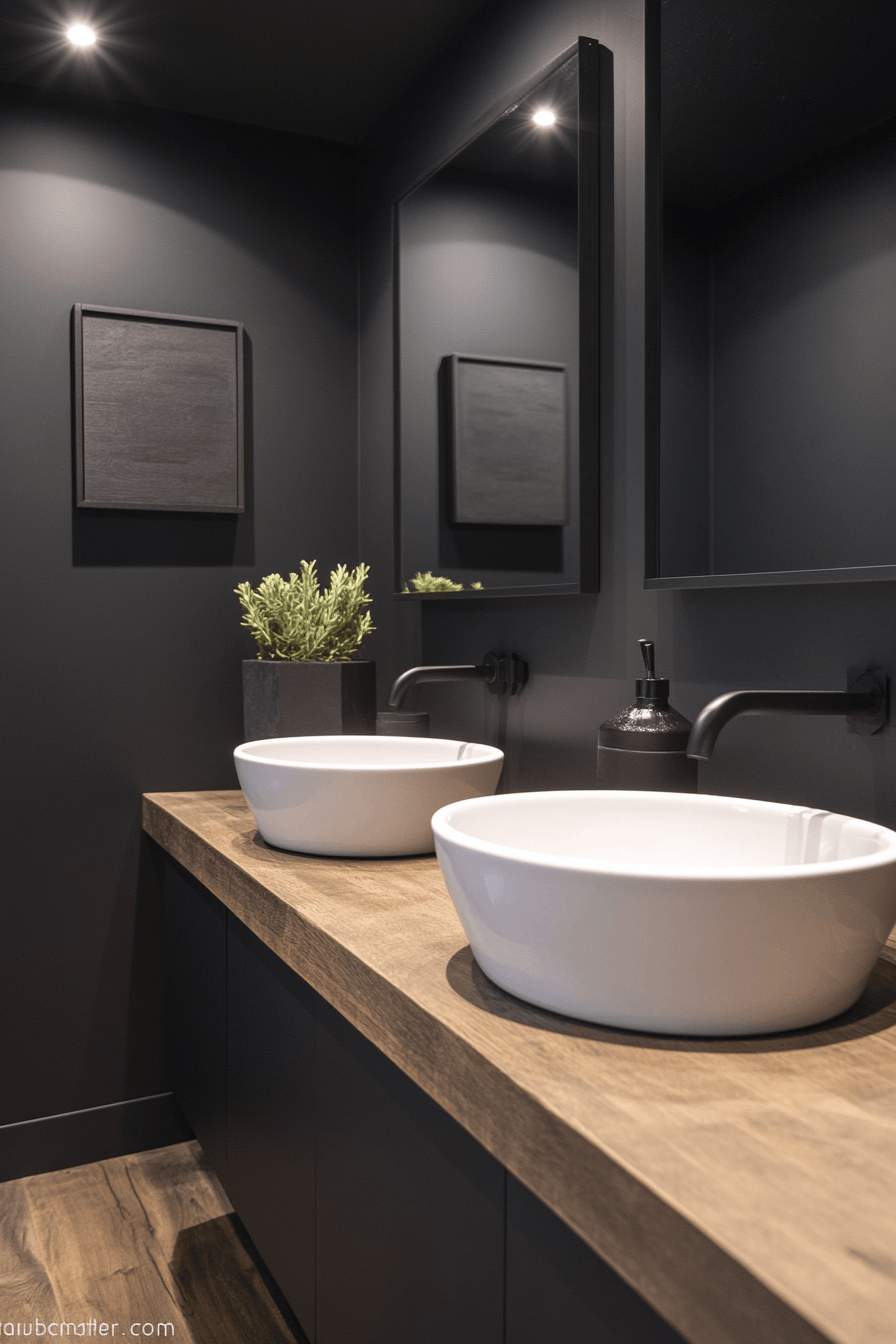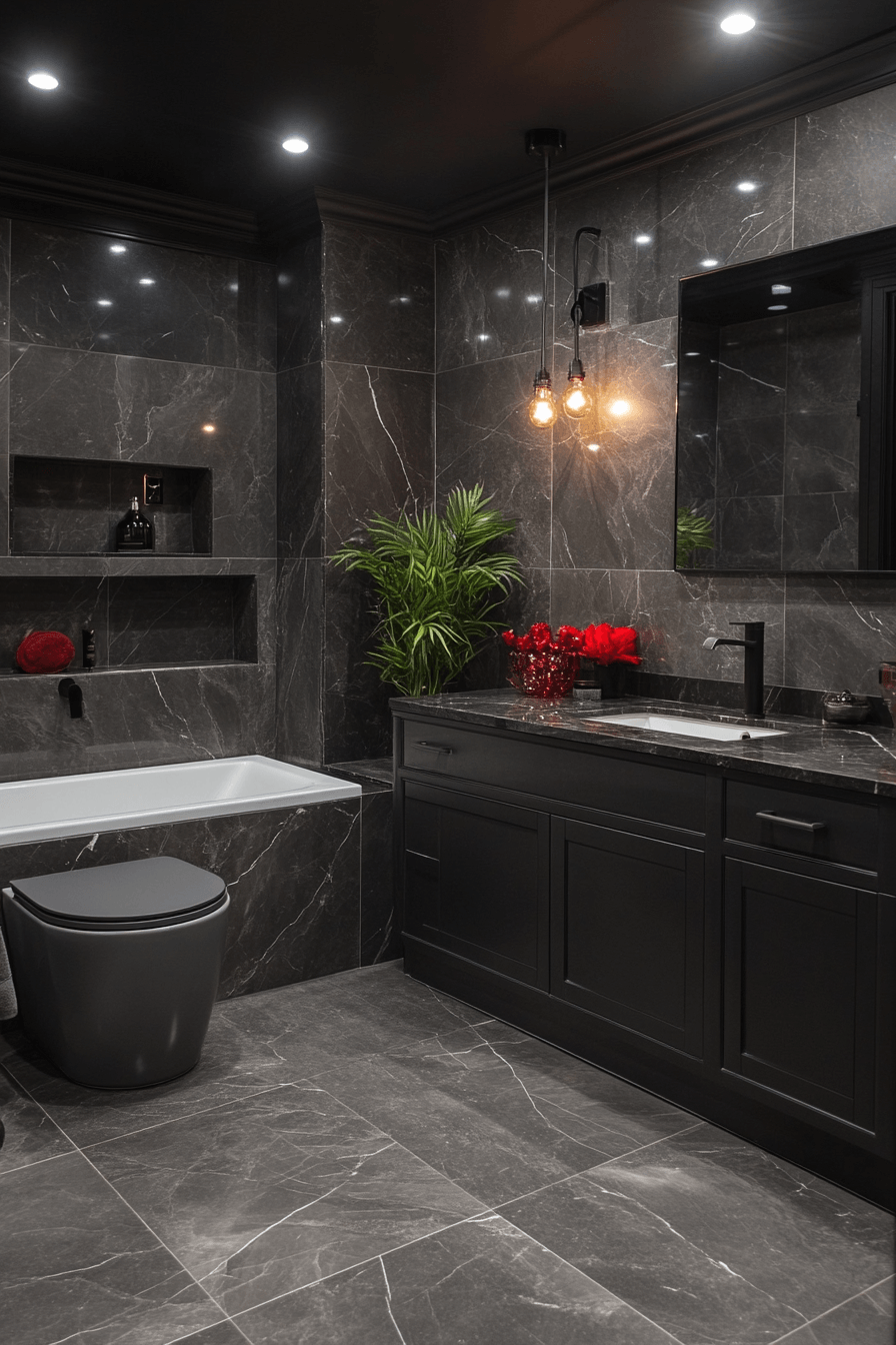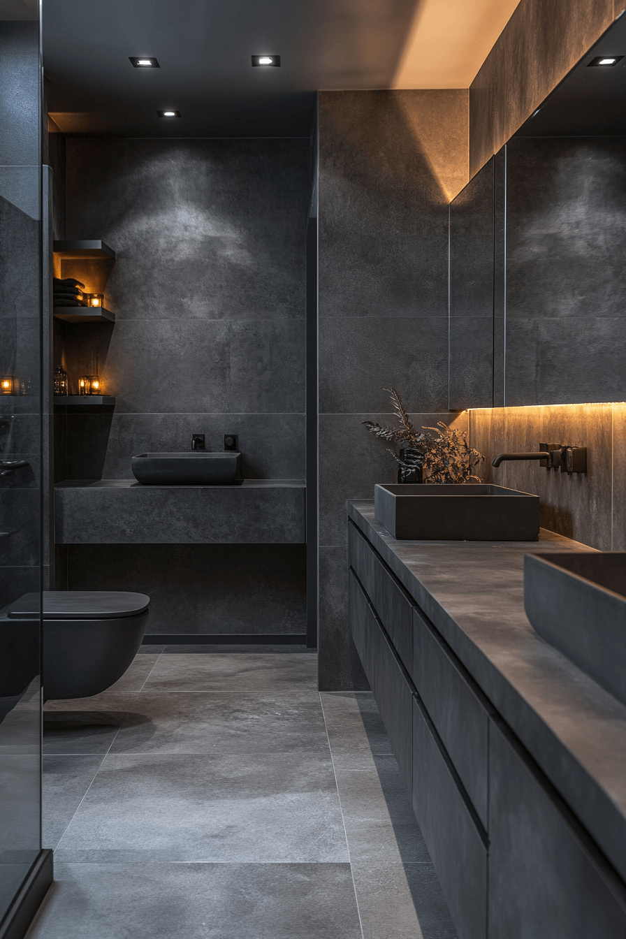 Soft warmth transforms a dark grey bathroom into a cozy retreat filled with inviting textures. Velvet-like finishes add depth and softness. Metallic accents brighten the palette. Warm décor elements enhance comfort. The space feels balanced and welcoming. Warm up your dark grey bathroom with this cozy approach!