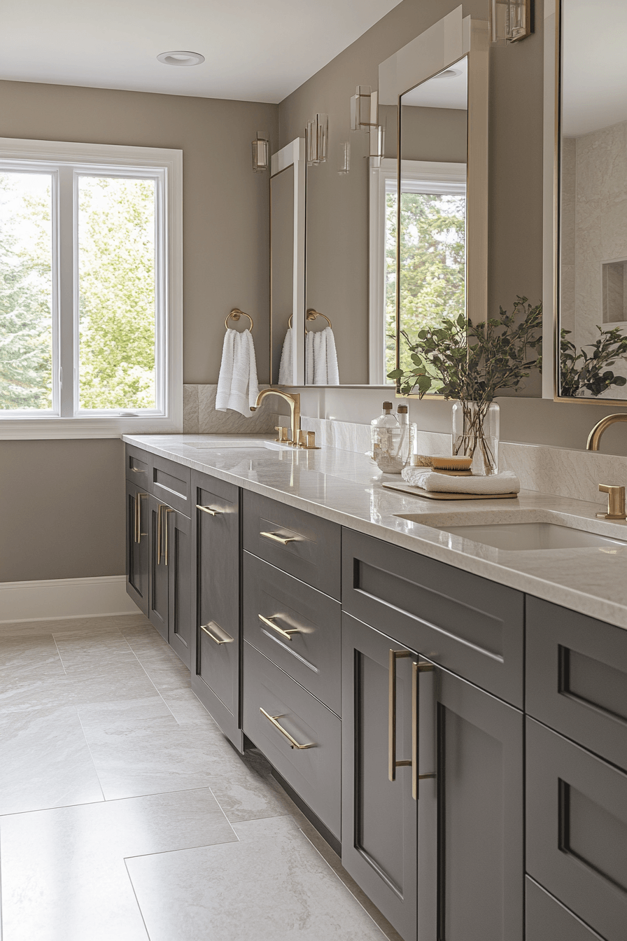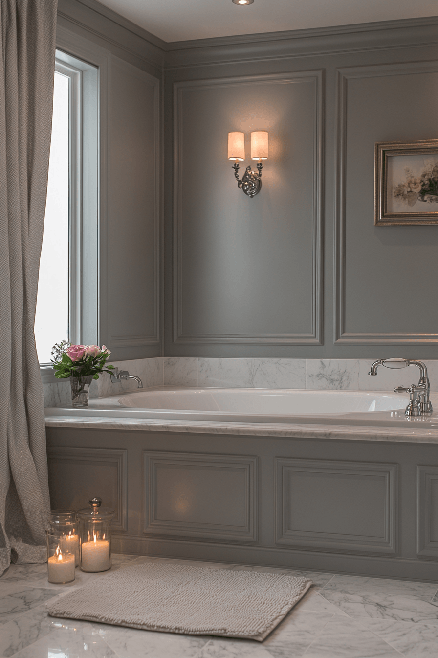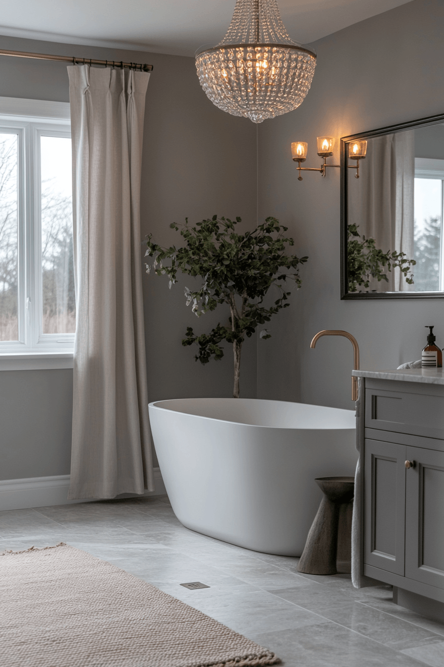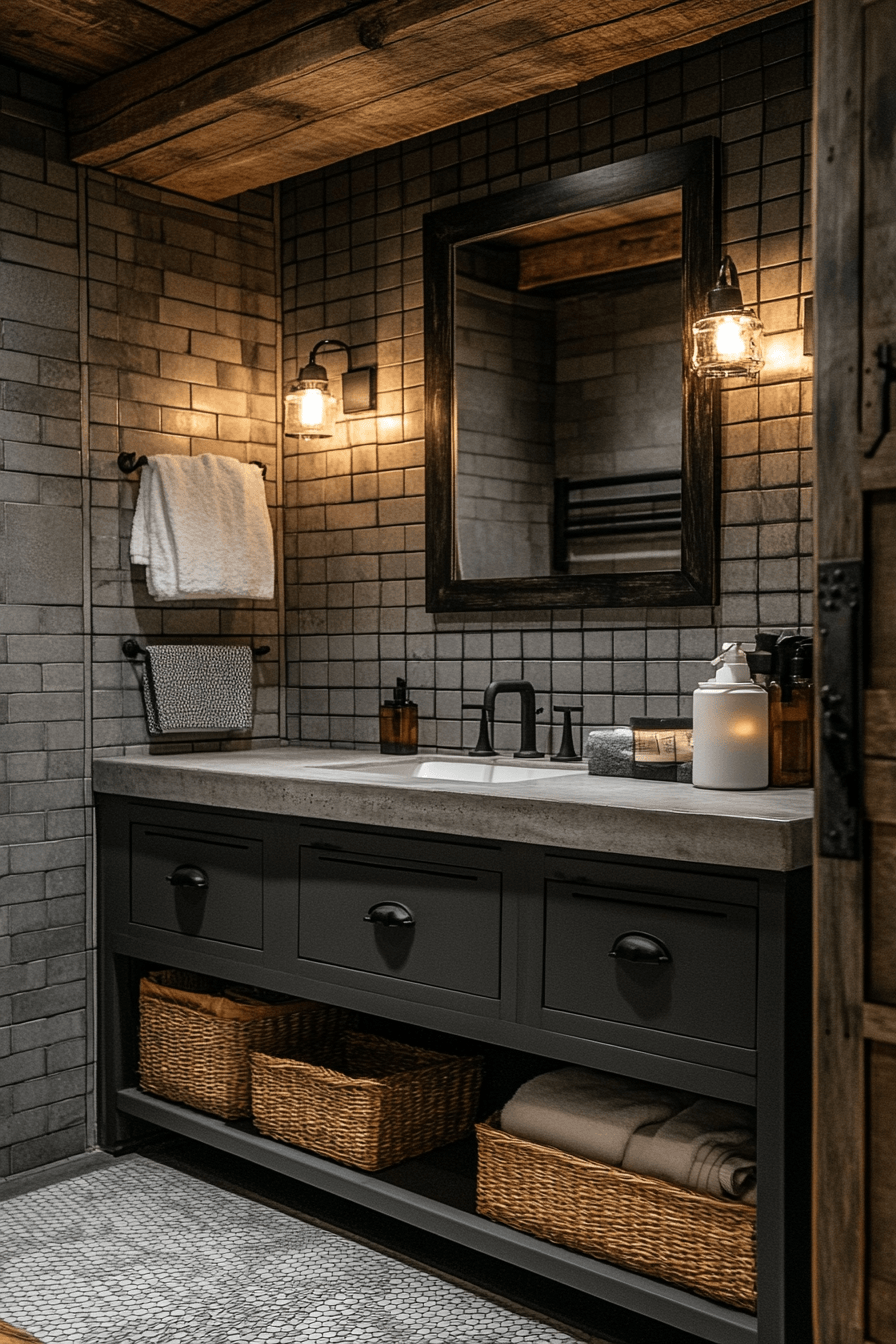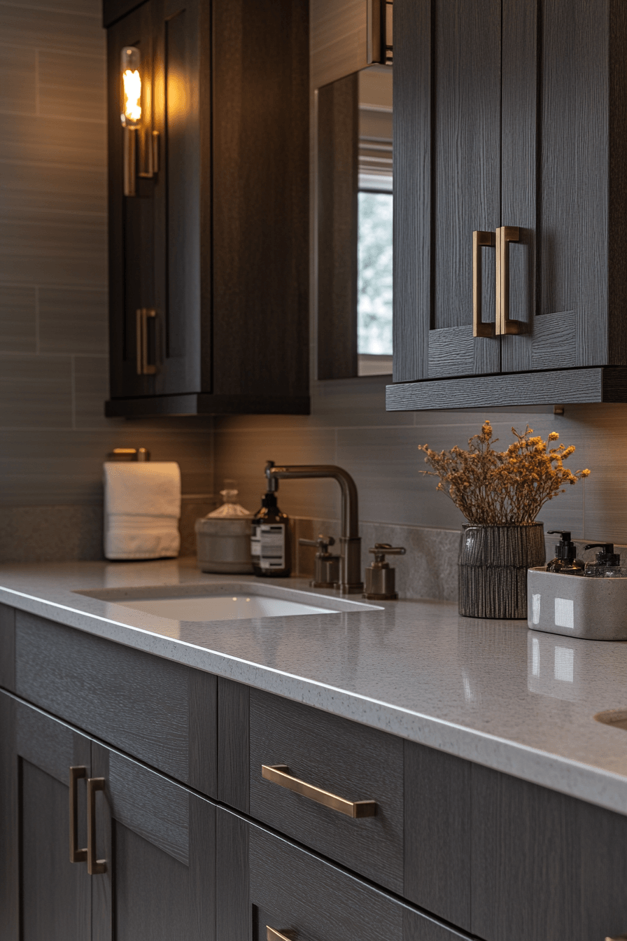 Soft warmth transforms a dark grey bathroom into a cozy retreat filled with inviting textures. Velvet-like finishes add depth and softness. Metallic accents brighten the palette. Warm décor elements enhance comfort. The space feels balanced and welcoming. Warm up your dark grey bathroom with this cozy approach!