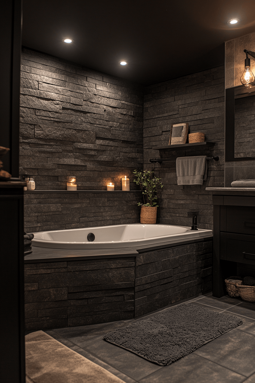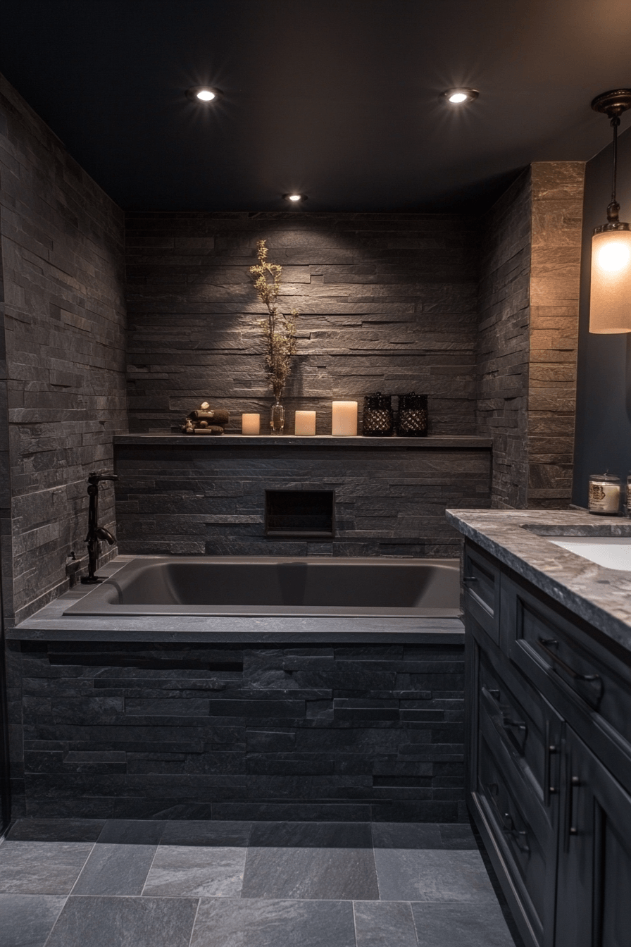 Full slate coverage creates a bold, immersive dark grey bathroom that feels like a private retreat. Deep tones wrap the space in calm. Soft lighting balances the intensity. Natural accents add warmth. The design feels luxurious and enveloping. Transform your dark grey bathroom into a spa-like haven!