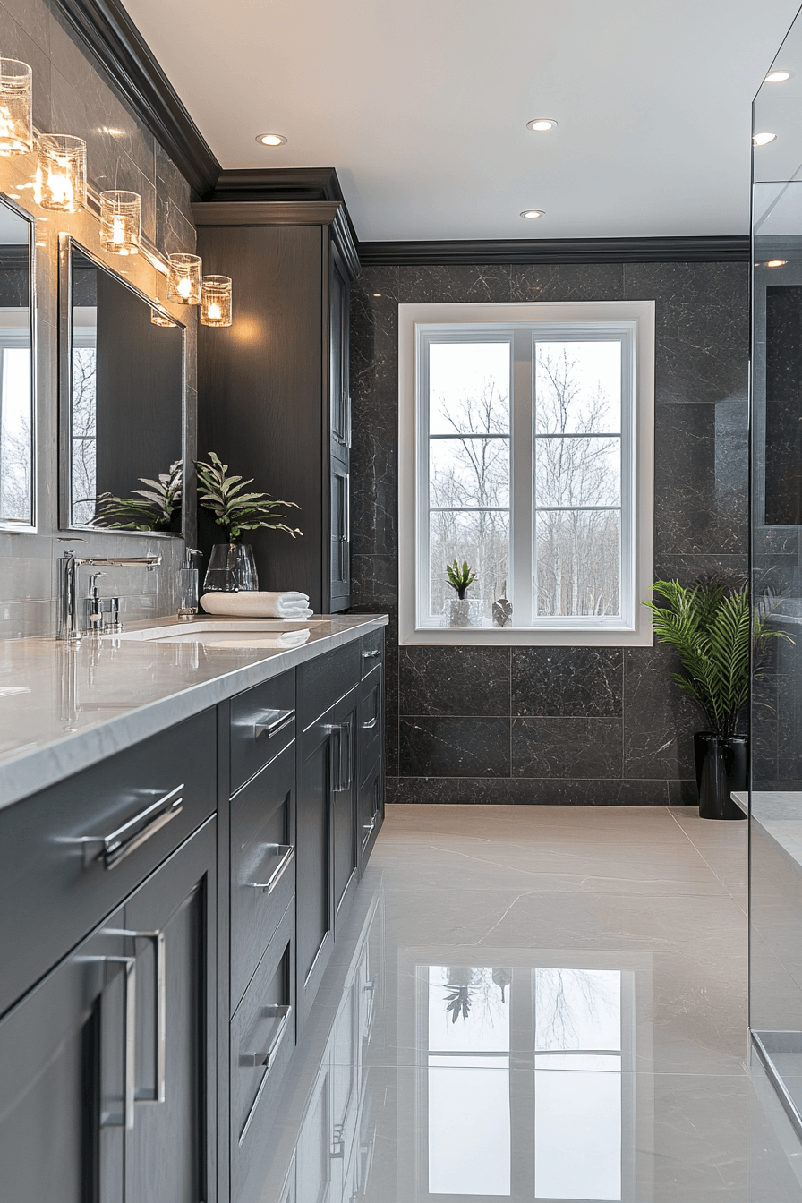 Glossy finishes bring brightness into a dark grey bathroom while maintaining its dramatic edge. Reflective surfaces bounce light across the room. Matte details create contrast and depth. Large mirrors enhance openness and clarity. The space feels luminous and modern. Brighten your dark grey bathroom with glossy accents!