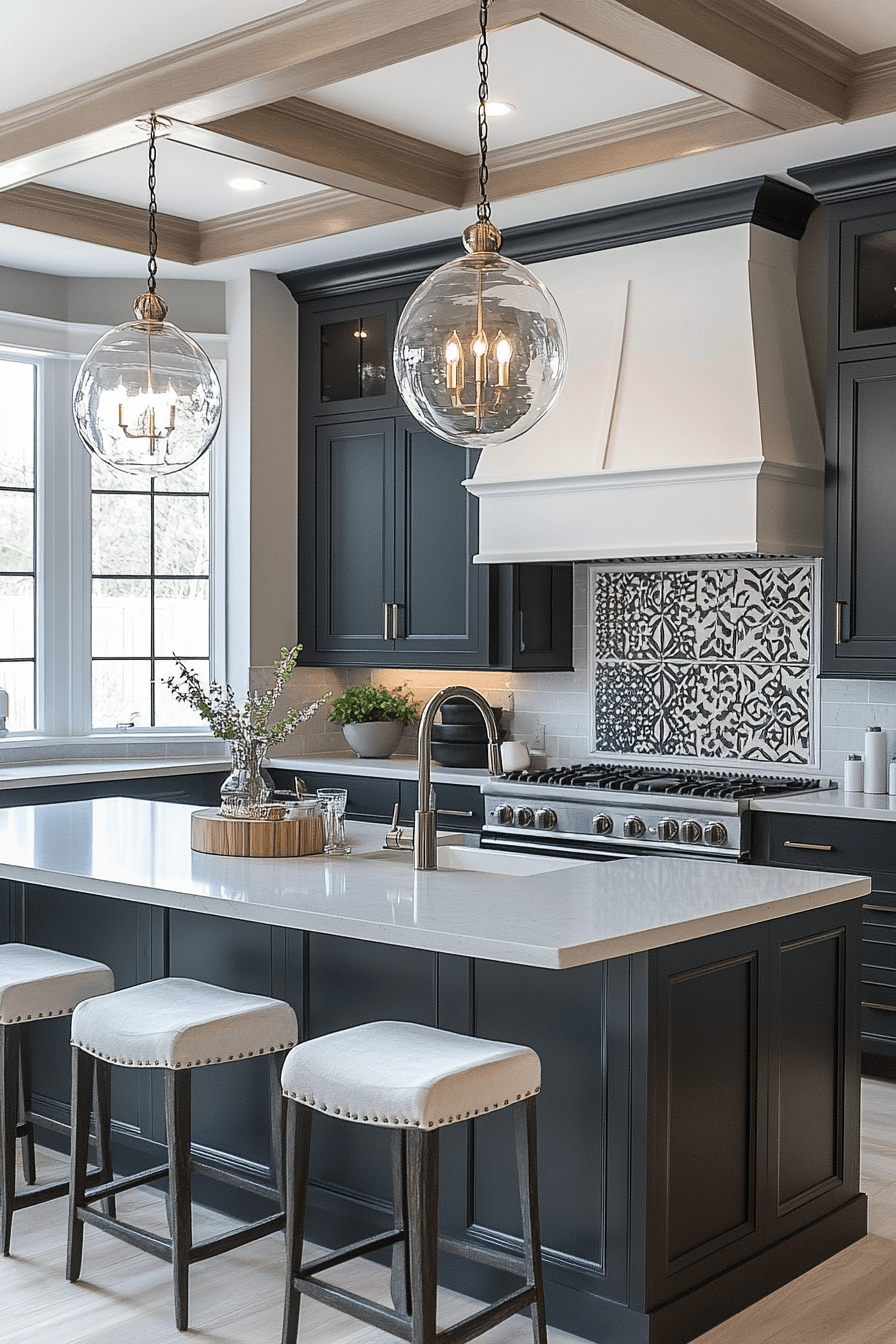 A bold modern mix adds personality to a dark grey kitchen through striking details and contrast. Clean cabinetry provides a structured base. Patterned elements and mixed finishes add excitement. A lighter island balances the palette. The space feels fresh and expressive. Give your dark grey kitchen a bold modern twist!