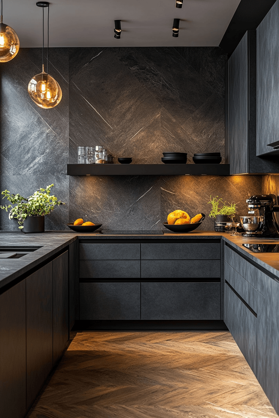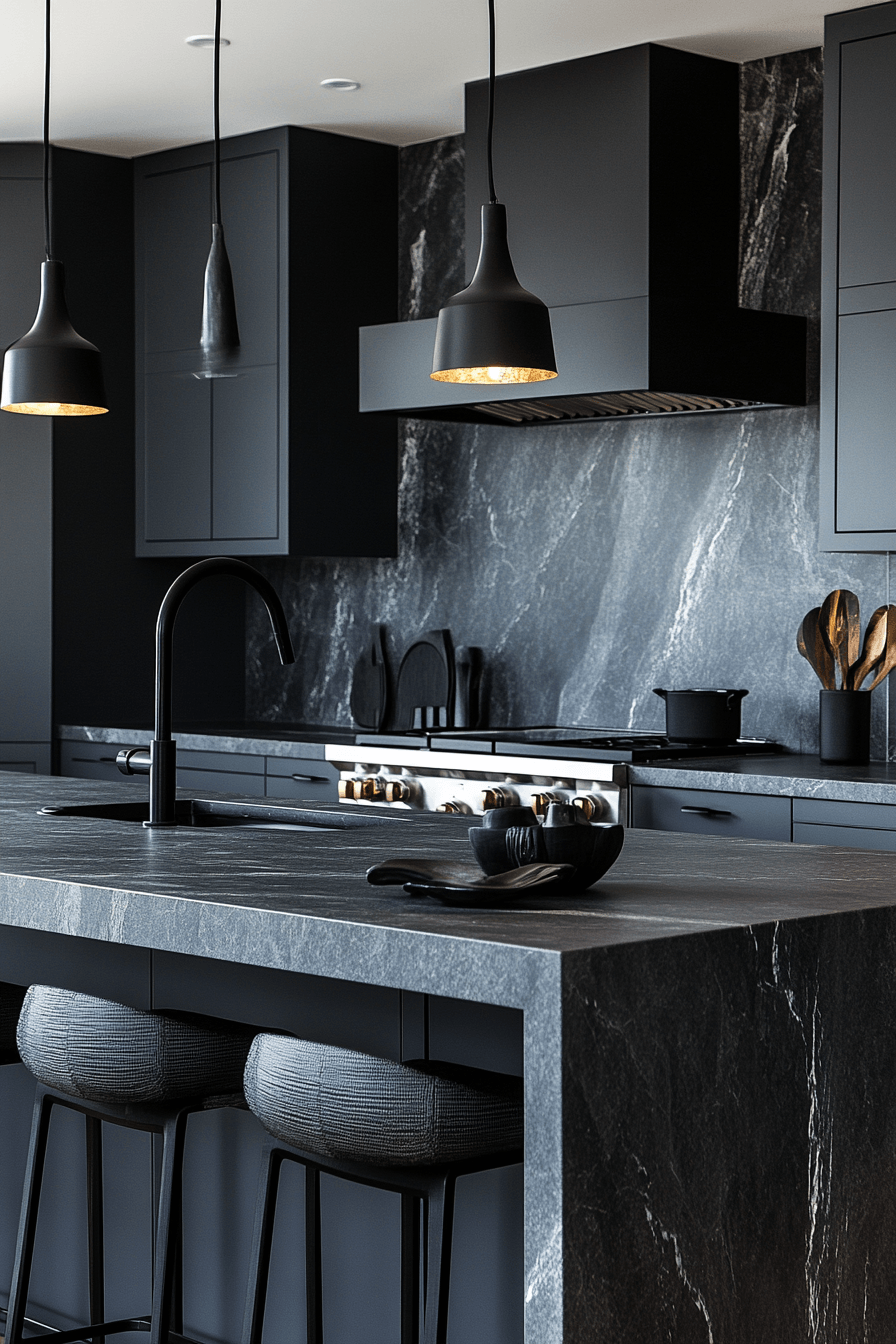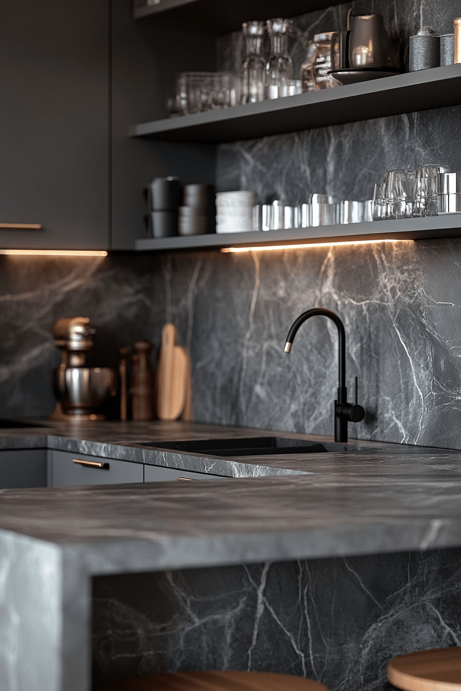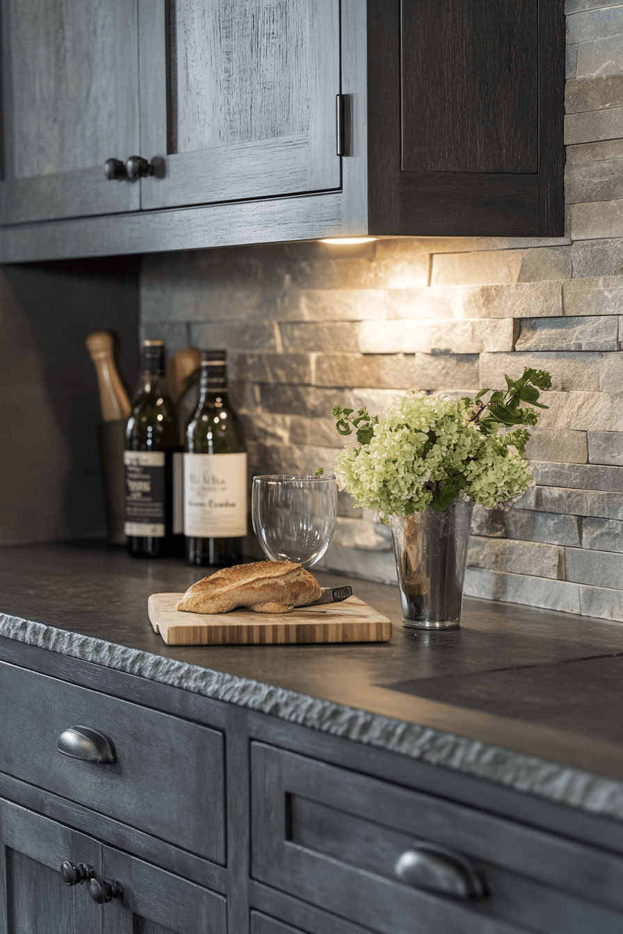 Slate textures create a layered look in a dark grey kitchen filled with depth and character. A textured backsplash adds visual interest. Smooth counters balance the rugged finish. Lighter flooring keeps the space fresh. The design feels refined and dynamic. Add slate-inspired texture to your dark grey kitchen!