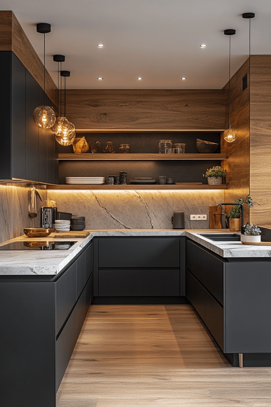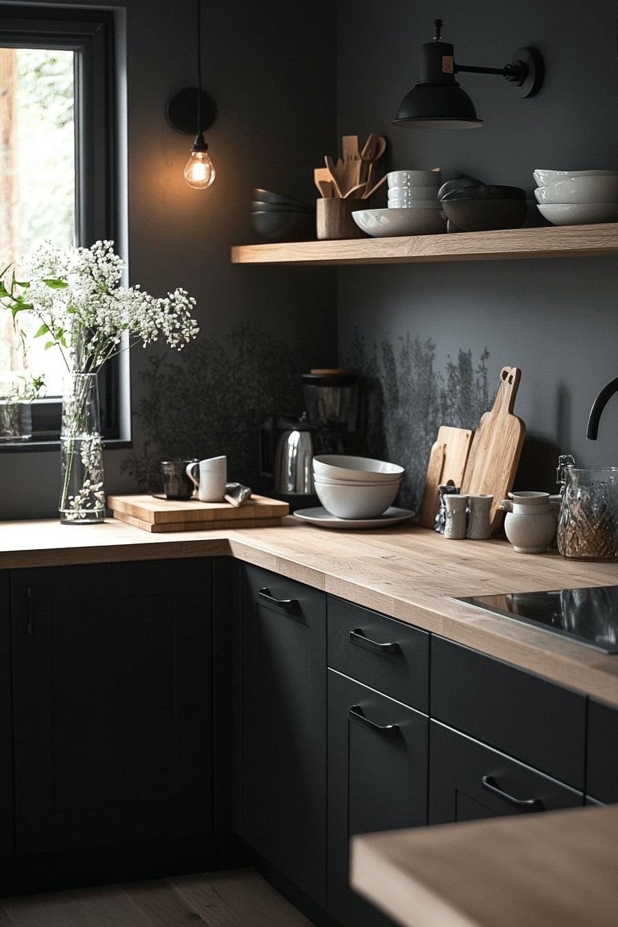 Natural wood details warm up a dark grey kitchen, creating a perfect balance of cool and cozy. Wooden shelves and seating add contrast. Light countertops keep the design fresh. The palette feels inviting and modern. The space remains cohesive and stylish. Add natural warmth to your dark grey kitchen effortlessly!