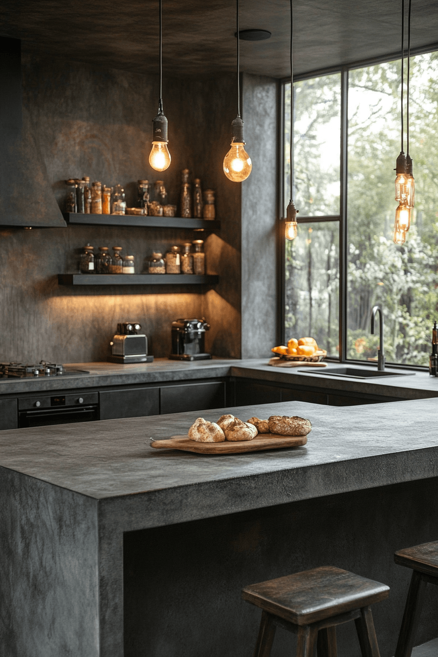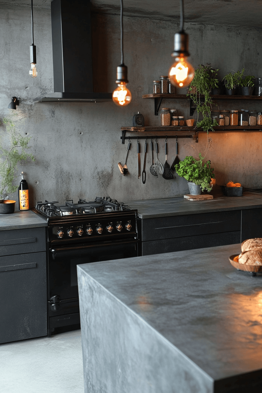 Industrial textures create depth in a dark grey kitchen with bold, urban appeal. Concrete floors and metal shelving add raw character. Dark cabinetry anchors the design. Statement lighting enhances the atmosphere. Warm metallic touches soften the look. Build a bold industrial dark grey kitchen with ease!
